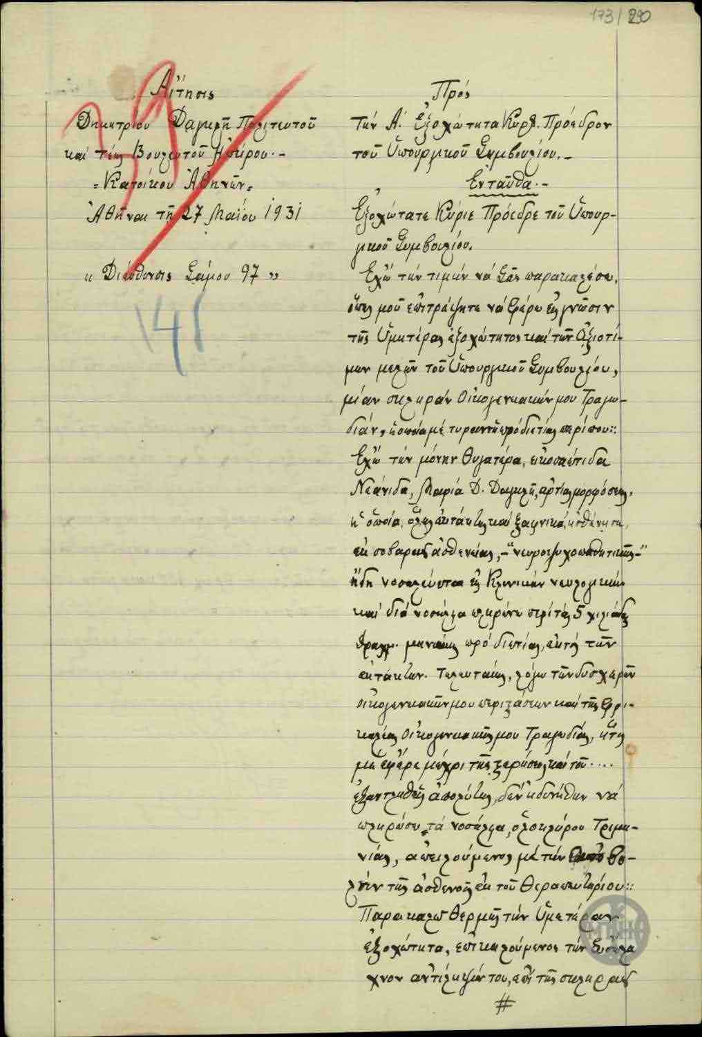 | ΤΙΤΛΟΣ | Αίτηση του Δημ. Δαγκλή, τέως Βουλευτή Ηπείρου, προς τον Ε. Βενιζέλο με την οποία ζητά οικονομική βοήθεια από το Δημόσιο. |