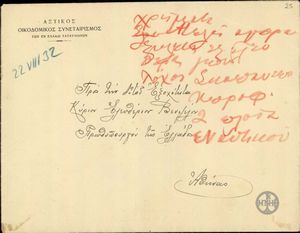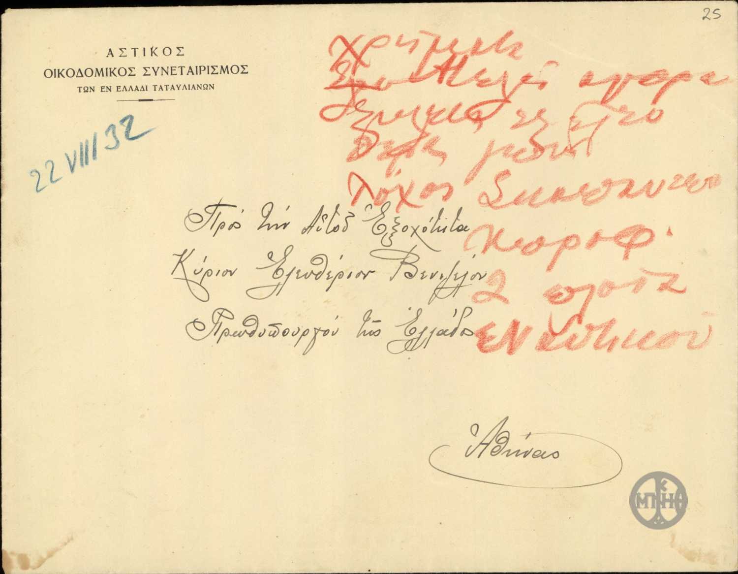 | ΤΙΤΛΟΣ | Επιστολή του Αστικού Οικοδομικού Συνεταιρισμού των εν Ελλάδι Ταταυλιανών προς τον Ε.Βενιζέλο σχετικά με το ζήτημα της στεγάσεώς τους. |