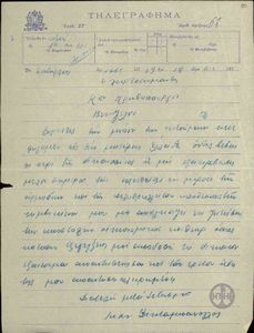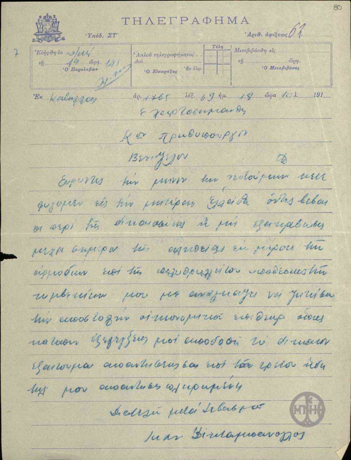 ΤΙΤΛΟΣ | Τηλεγράφημα του Ιωάννη Δικταμπάνογλου προς τον Ε.Βενιζέλο με το οποίο ζητεί την αποστολή οικονομικού επιθεωρητή για έλεγχο και απόδοση δικαιοσύνης για την υπόθεση των τυμβεκίων. |