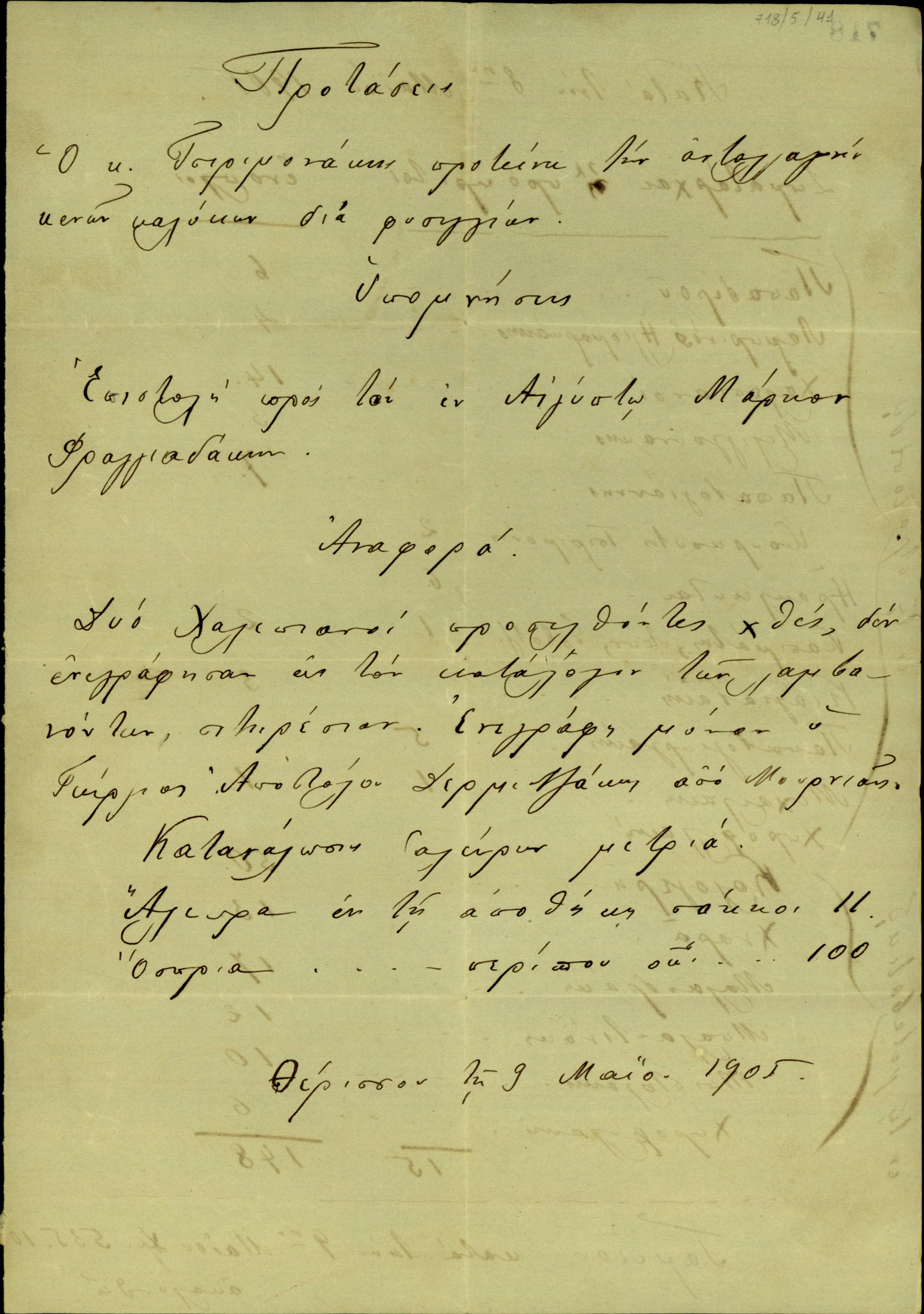 | ΤΙΤΛΟΣ | Αναφορά του Α. Παπαδάκη προς τον Ελ. Βενιζέλο σχετικά με έξοδα της Επαναστατικής Συνέλευσης του Θερίσου. |