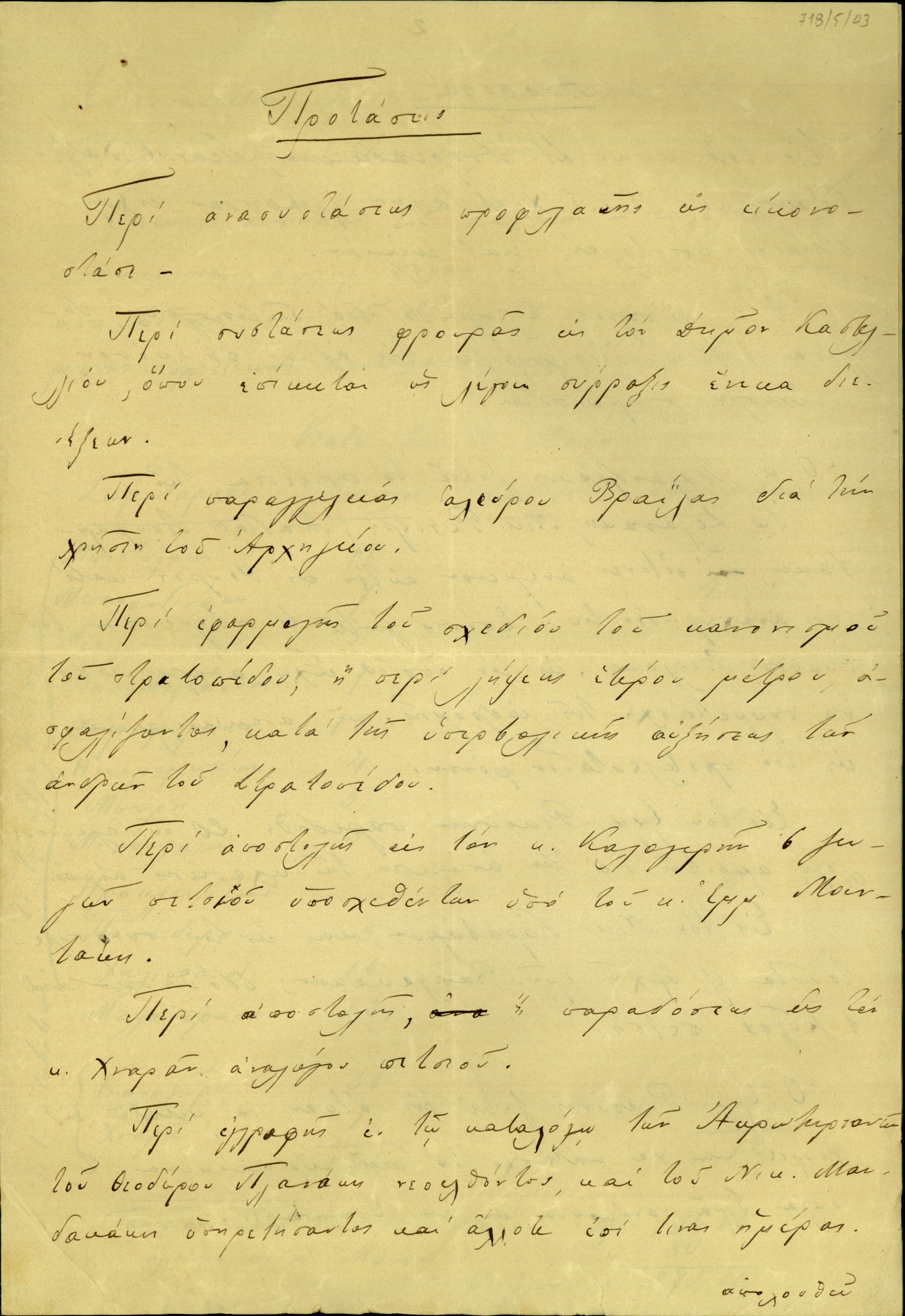 | ΤΙΤΛΟΣ | Αναφορά του Α. Παπαδάκη προς τον Ελ. Βενιζέλο σχετικά με οικονομικά ζητήματα και ζητήματα προς επίλυση ή υλοποίηση. |