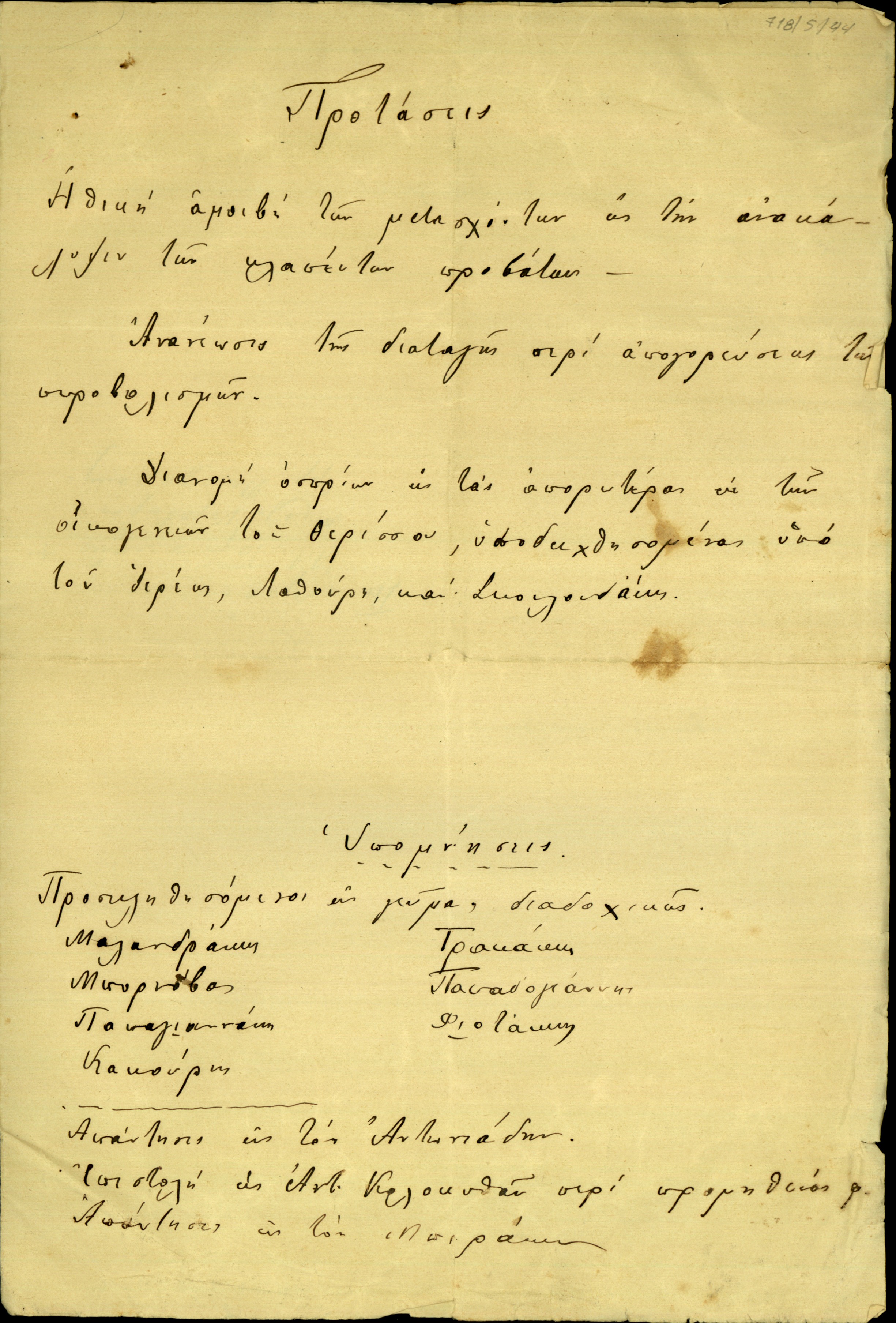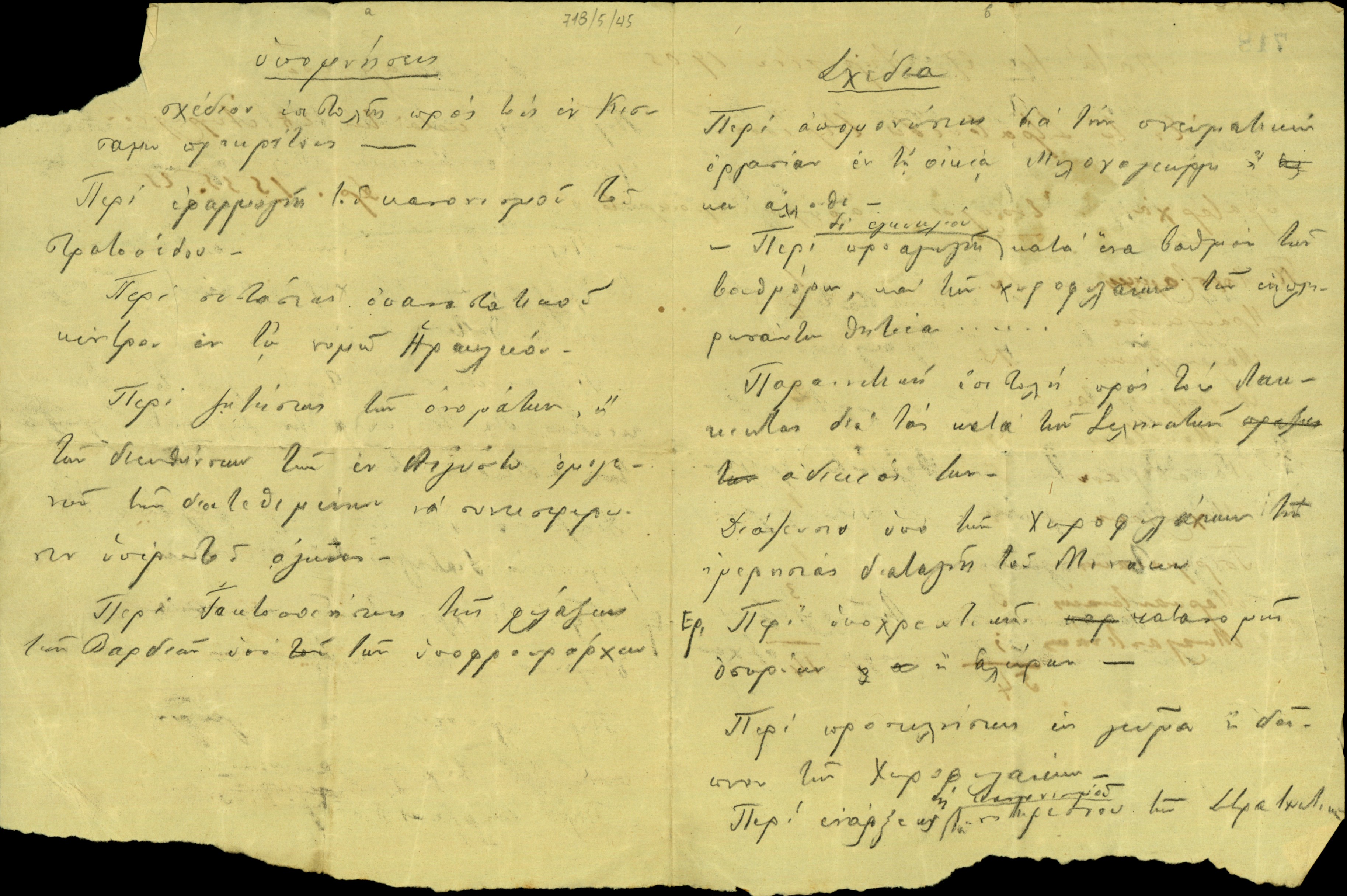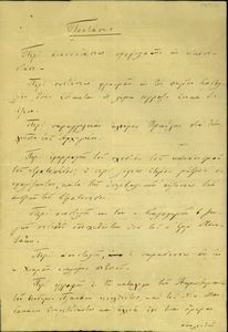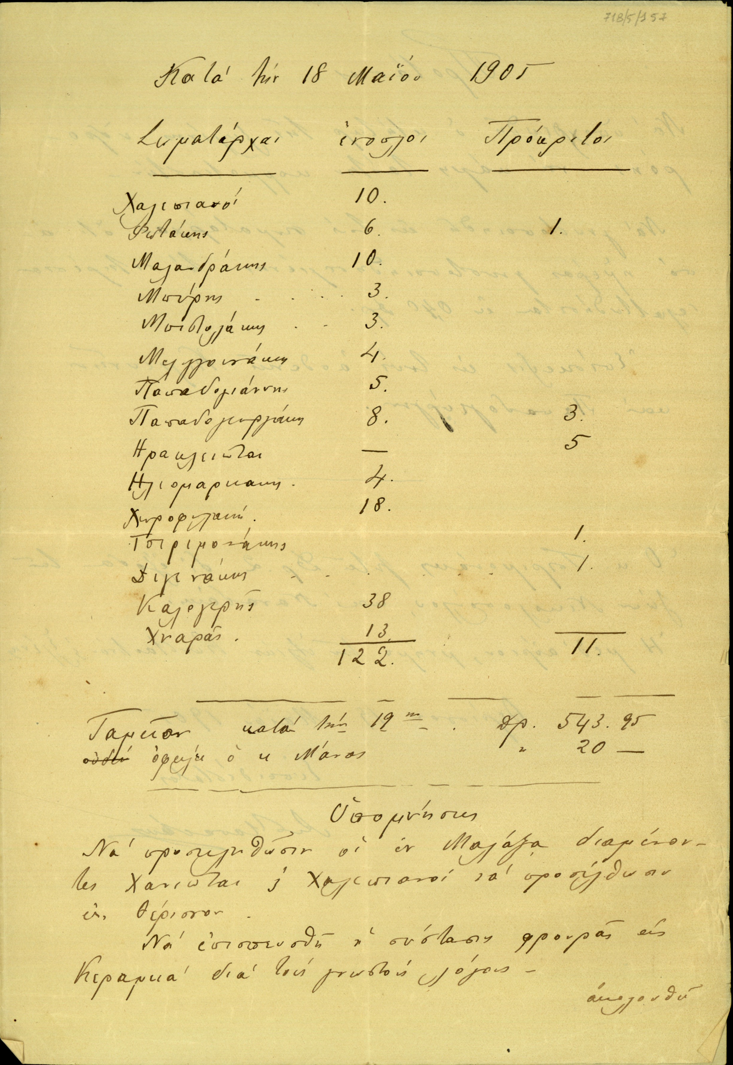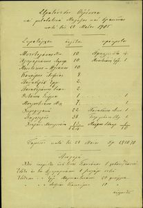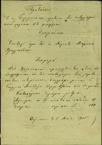 | ΤΙΤΛΟΣ | Σημείωμα του Α. Παπαδάκη στο οποίο περιλαμβάνονται κατάλογος με τους ένοπλους που είχαν οι σωματάρχες και οι πρόκριτοι καθώς και αναφορές σε τρέχοντα ζητήματα για την Επαναστατική Συνέλευση όπως την πρόταση του Τσιριμονάκη για την ανταλλαγή κενών καλύκων με φυσίγγια κ.α. |