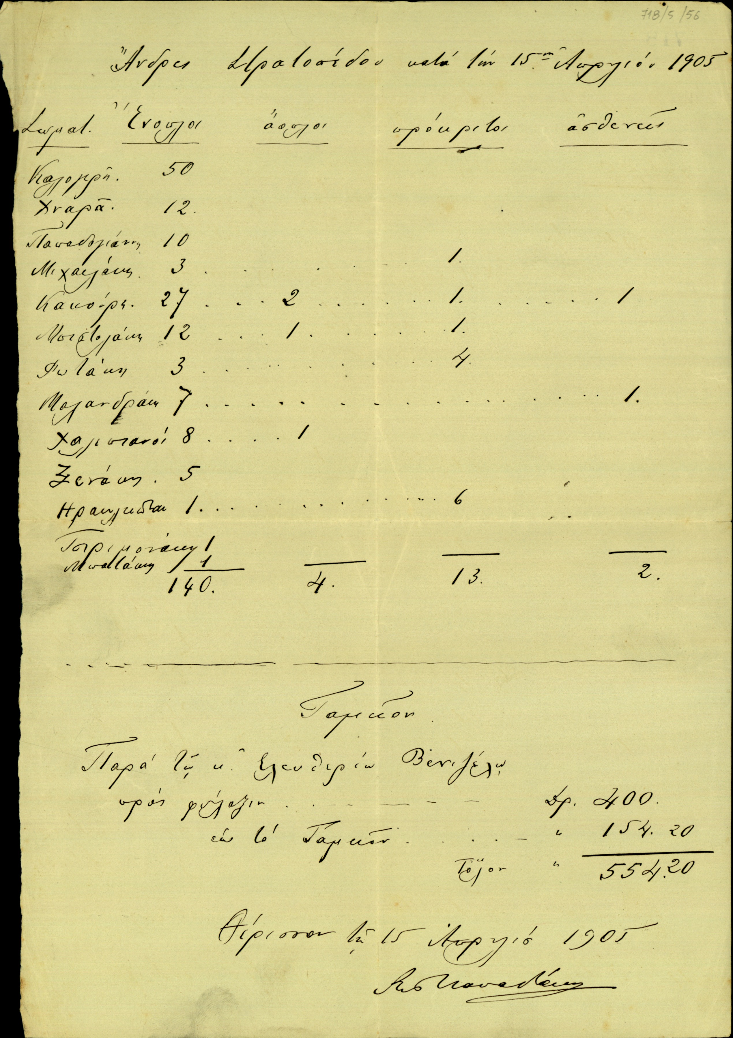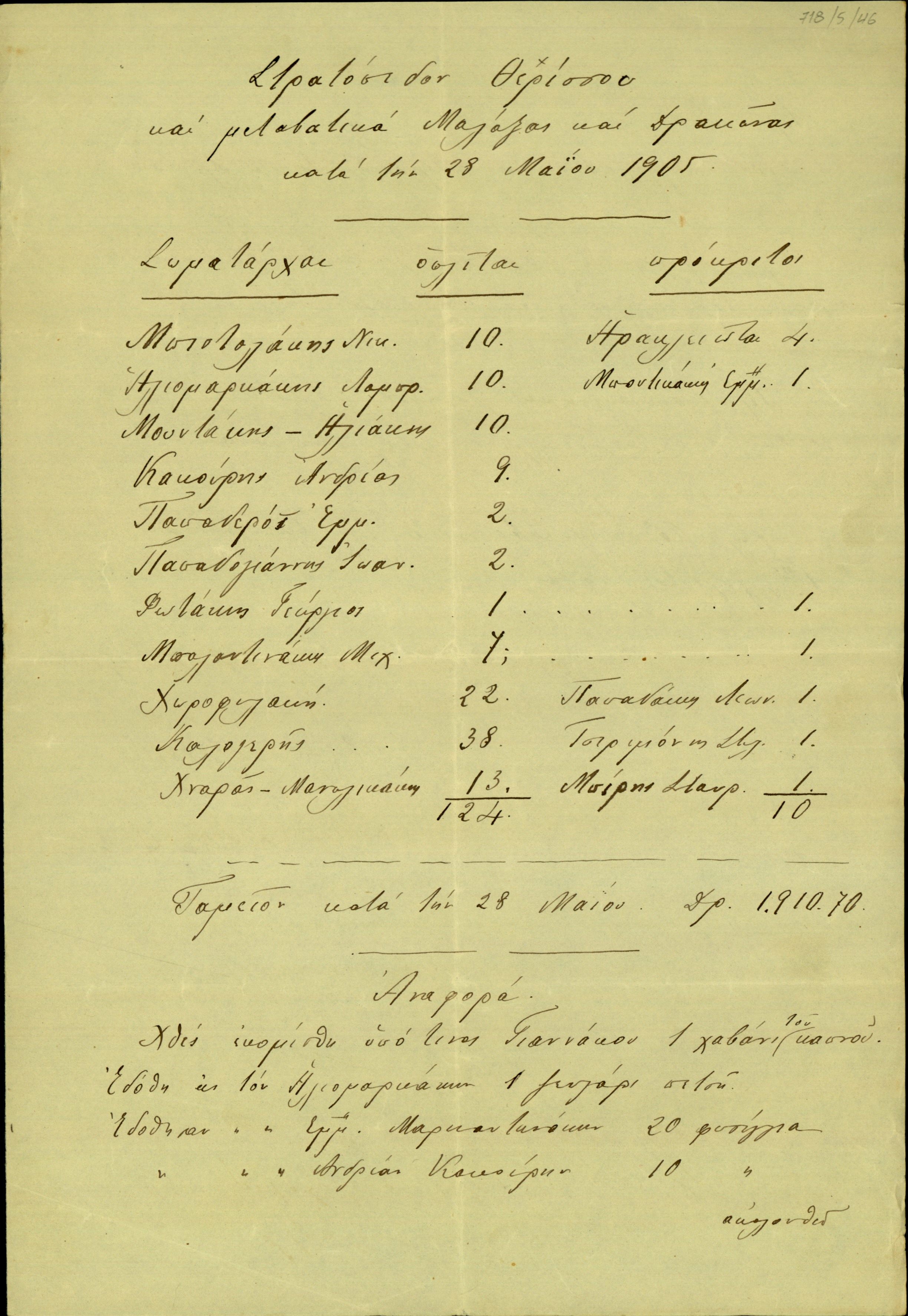 | ΤΙΤΛΟΣ | Σημείωμα σχετικά με τους άνδρες του στρατοπέδου στον Θέρισο κατά τη 15η Απριλίου 1905 καθώς και το υπόλοιπο του ταμείου της Επαναστατικής Συνέλευσης. |