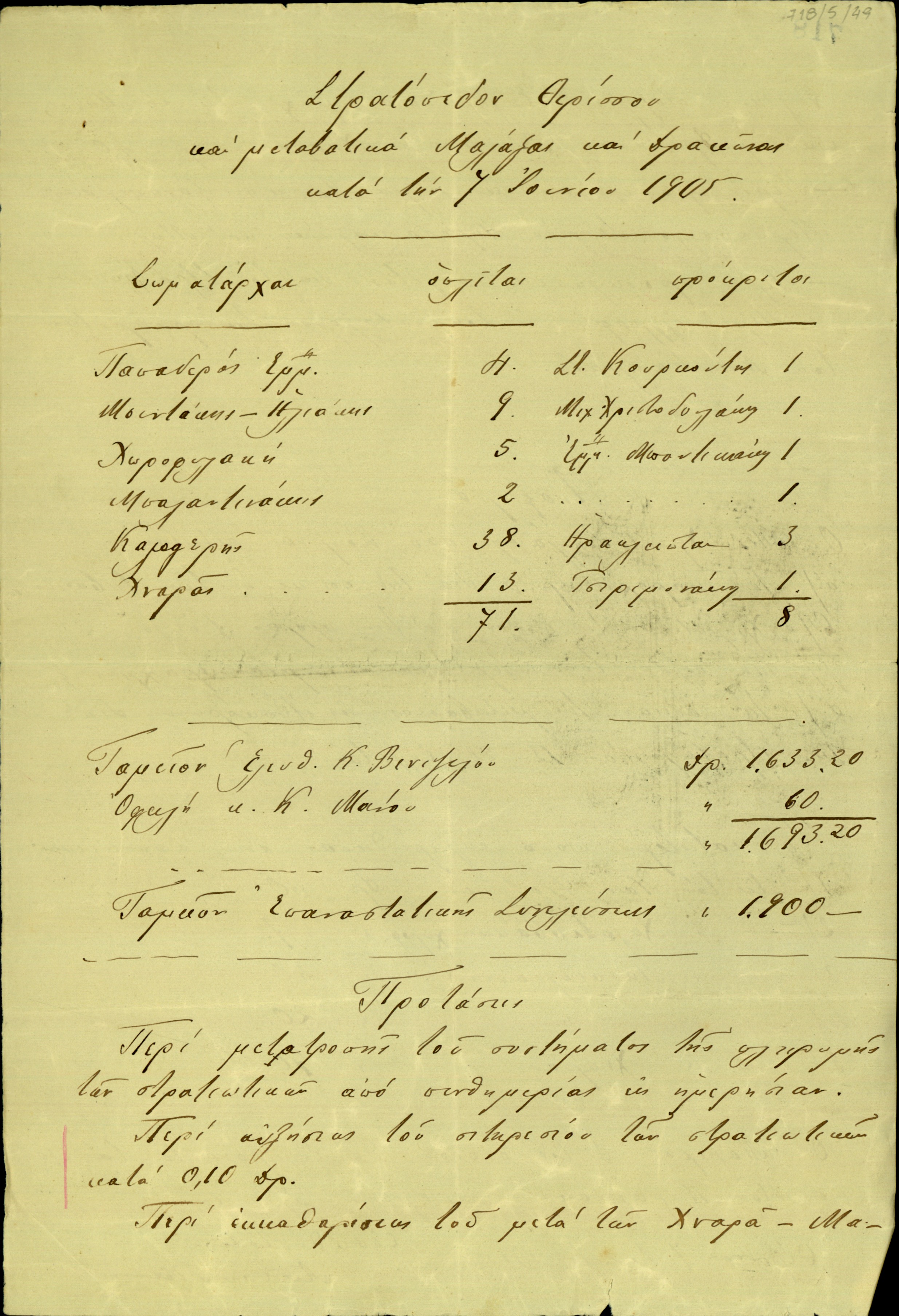 | ΤΙΤΛΟΣ | Αναφορά του Α. Παπαδάκη προς τον Ελ. Βενιζέλο σχετικά με οικονομικά στοιχεία και έξοδα της Επαναστατικής Συνέλευσης Θερίσου. |