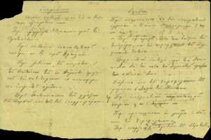 | ΤΙΤΛΟΣ | Σημείωμα του Α. Παπαδάκη στο οποίο περιλαμβάνονται υπενθυμίσεις και αναφορές για ζητήματα της Επαναστατικής Συνέλευσης Θερίσου, κατάλογος με τους άνδρες που βρίσκονται στο στρατόπεδο του Θερίσου και τα μεταβατικά των Μαλαξών και των Δρακώνων καθώς και το χρηματικό υπόλοιπο του ταμείου της. |