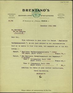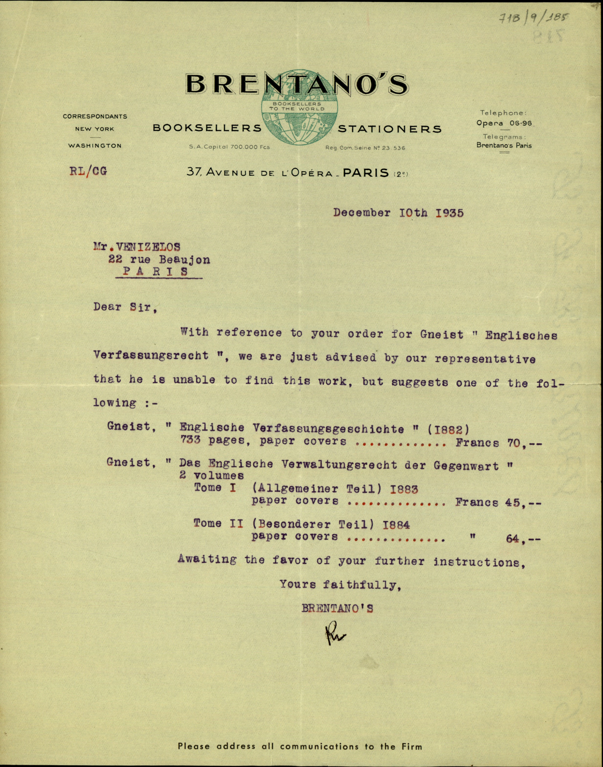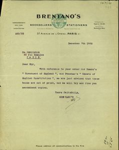 | ΤΙΤΛΟΣ | Επιστολή της Brentano' s προς τον Ελ. Βενιζέλο με την οποία τον ενημερώνει ότι τα βιβλία που ζήτησε δεν εκδίδονται πια και ότι θα προσπαθήσει να τα βρει από δεύτερο χέρι. |