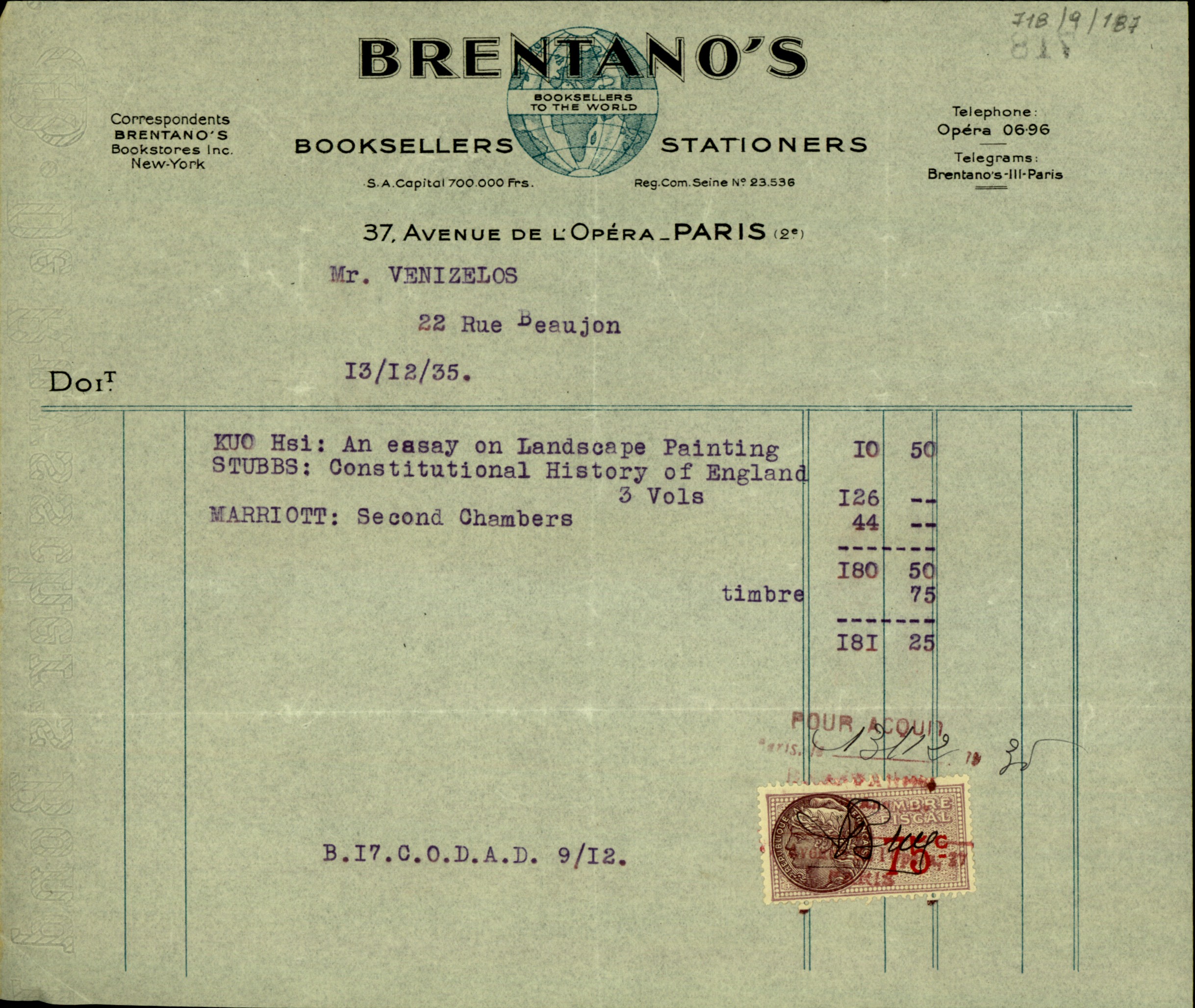 | ΤΙΤΛΟΣ | Τιμολόγιο της Brentano' s προς τον Ελ. Βενιζέλο για την αγορά βιβλίου. |