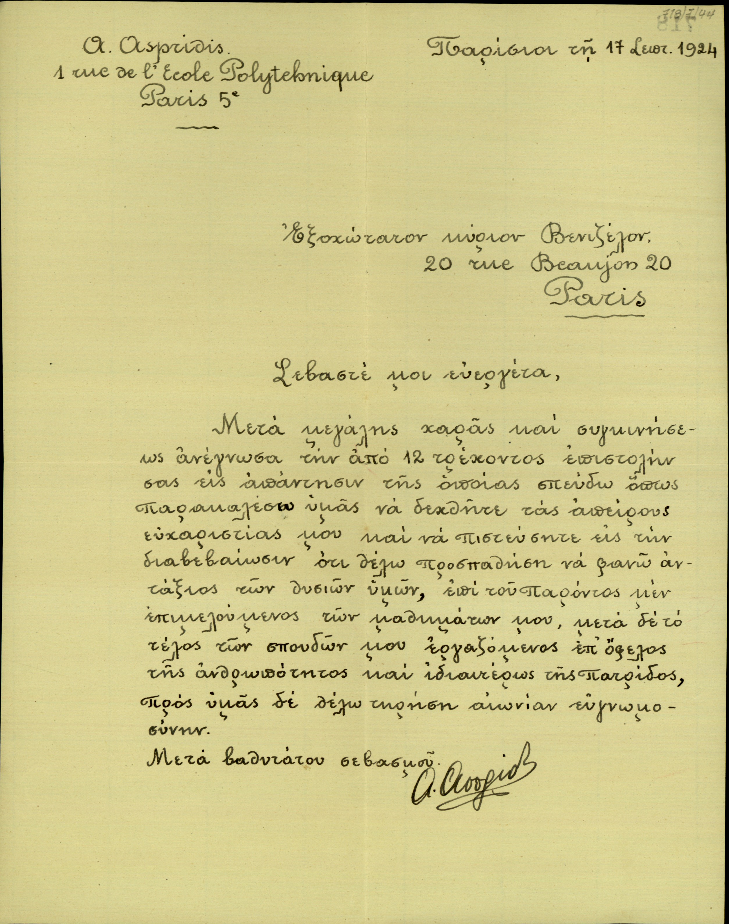 | ΤΙΤΛΟΣ | Επιστολή του Α. Ασπρίδη προς τον Ελ. Βενιζέλο με την οποία του απαντά σε προηγούμενή του επιστολή και τον διαβεβαιώνει ότι θα προσπαθήσει να φανεί αντάξιος των θυσιών του εργαζόμενος, μετά το τέλος των σπουδών του, για το καλό της ανθρωπότητας και ιδιαίτερα της πατρίδας του εκφράζοντάς του, παράλληλα, την αιώνια ευγνωμοσύνη του. |