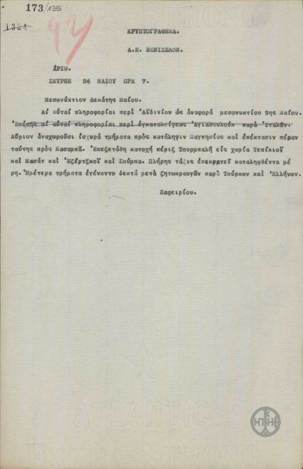 ΤΙΤΛΟΣ | Τηλεγράφημα του Ζαφειρίου προς τον Ε.Βενιζέλο σχετικά με την κατάσταση που επικρατεί στην περιοχή της Σμύρνης. |