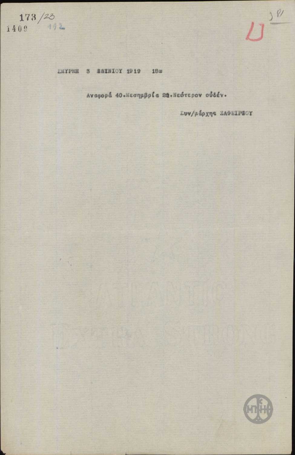 ΤΙΤΛΟΣ | Τηλεγράφημα του Ζαφειρίου σχετικά με την αναφορά του για τις εξελίξεις στη Σμύρνη. |