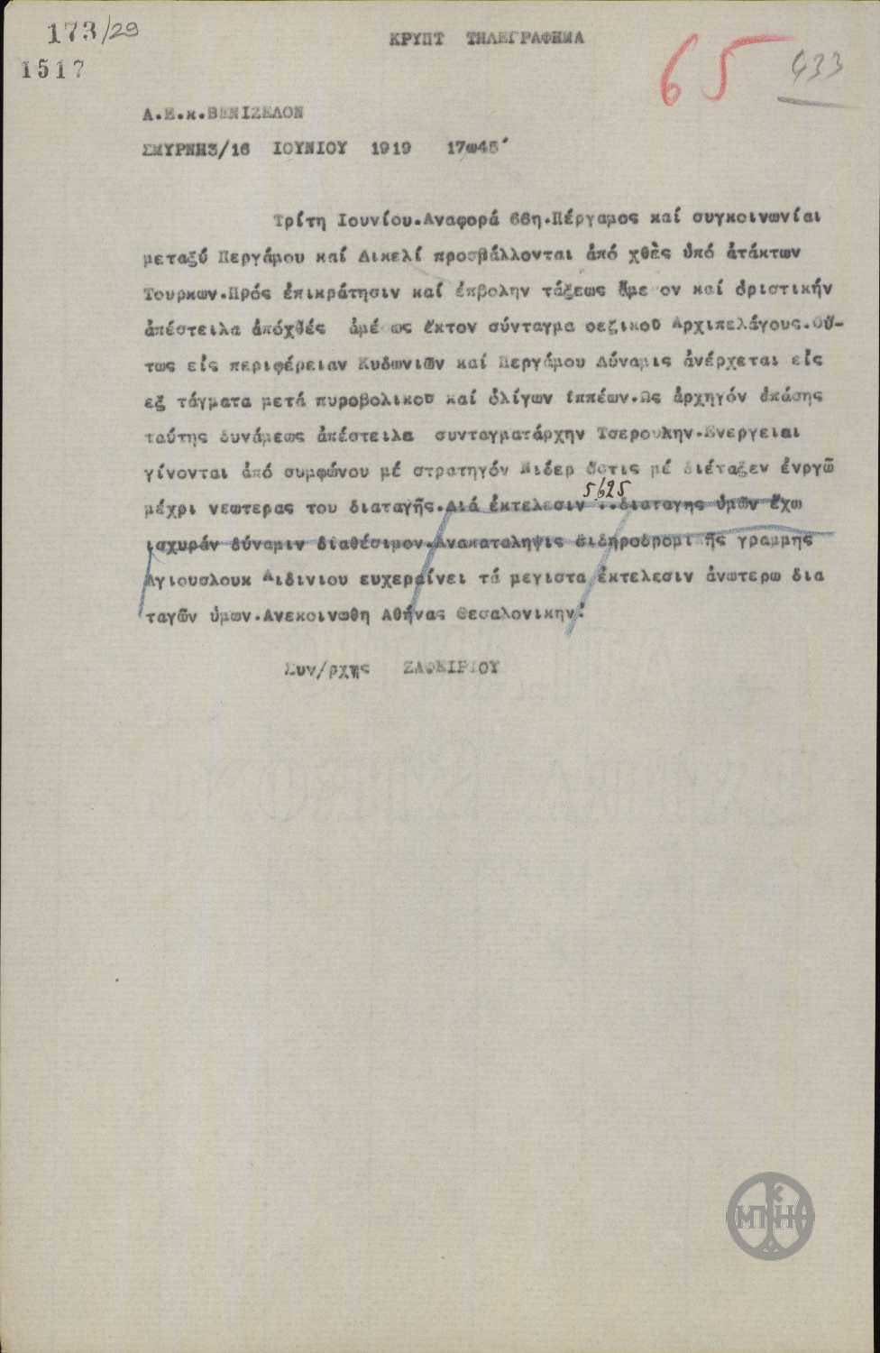 ΤΙΤΛΟΣ | Τηλεγράφημα του Συνταγματάρχη Ζαφειρίου προς τον Ε.Βενιζέλο για την κατάσταση στην περιφέρεια της Σμύρνης. |