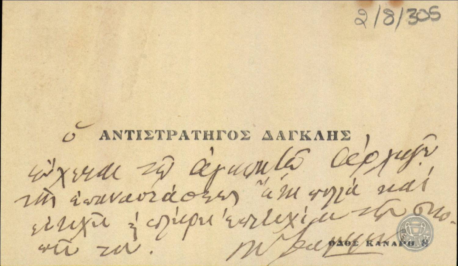 | ΤΙΤΛΟΣ | Επιστολή του Π.Δαγκλή προς τον Ε.Βενιζέλο, με την οποία κατακρίνει τις πολιτικές και στρατιωτικές επιλογές της Ελληνικής Κυβέρνησης. |