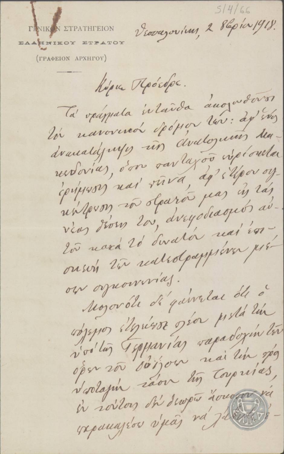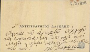 | ΤΙΤΛΟΣ | Επιστολή του Π.Δαγκλή προς τον Ε.Βενιζέλο σχετικά με την αναδιάταξη των στρατιωτικών δυνάμεων στο Σερβικό και Θρακικό Μέτωπο. |
