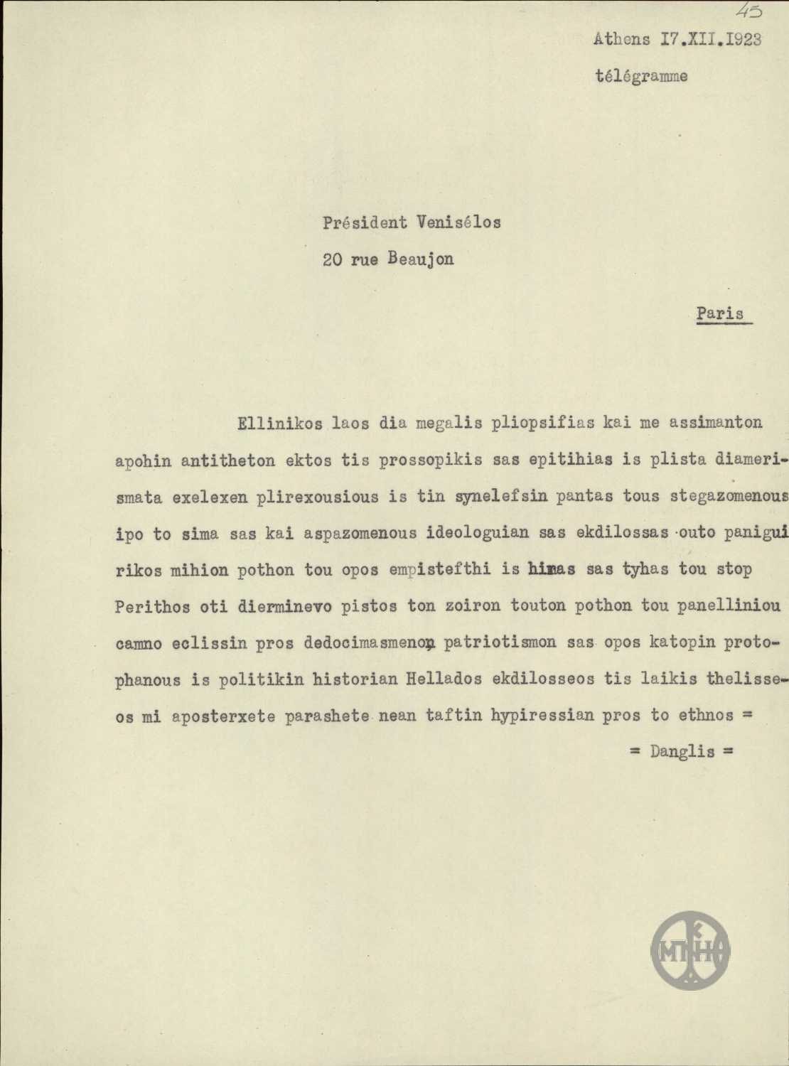 | ΤΙΤΛΟΣ | Τηλεγράφημα του Π.Δαγκλή προς τον Ε.Βενιζέλο, με το οποίο τον καλεί να επιστρέψει στην Ελλάδα. |
