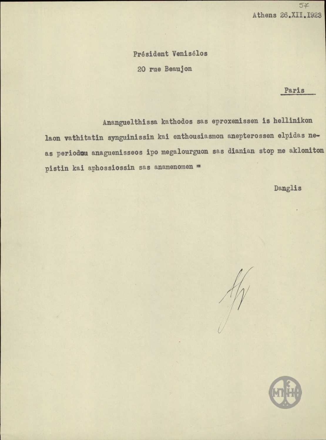 | ΤΙΤΛΟΣ | Τηλεγράφημα του Π.Δαγκλή προς τον Ε.Βενιζέλο σχετικά με τη συγκίνηση που προκάλεσε στον ελληνικό λαό η απόφαση του Ε.Βενιζέλου να επιστρέψει στην Ελλάδα. |