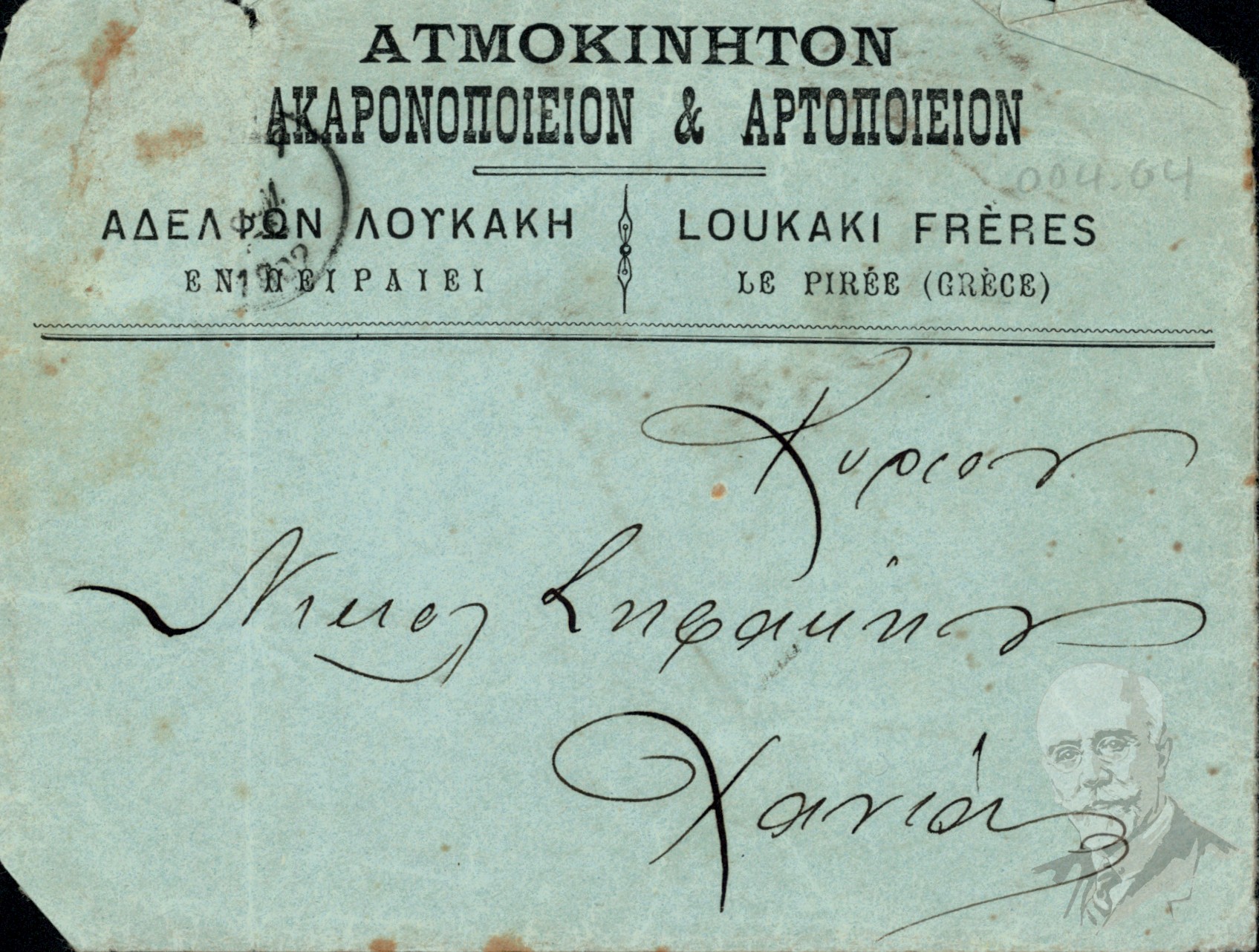 Φάκελος με έντυπο λογότυπο "Ατμοκίνητον μακαρονοποιείον και αρτοποιείον Αδελφών Λουκάκη, εν Πειραιεί" και χειρόγραφα το όνομα του παραλήπτη.