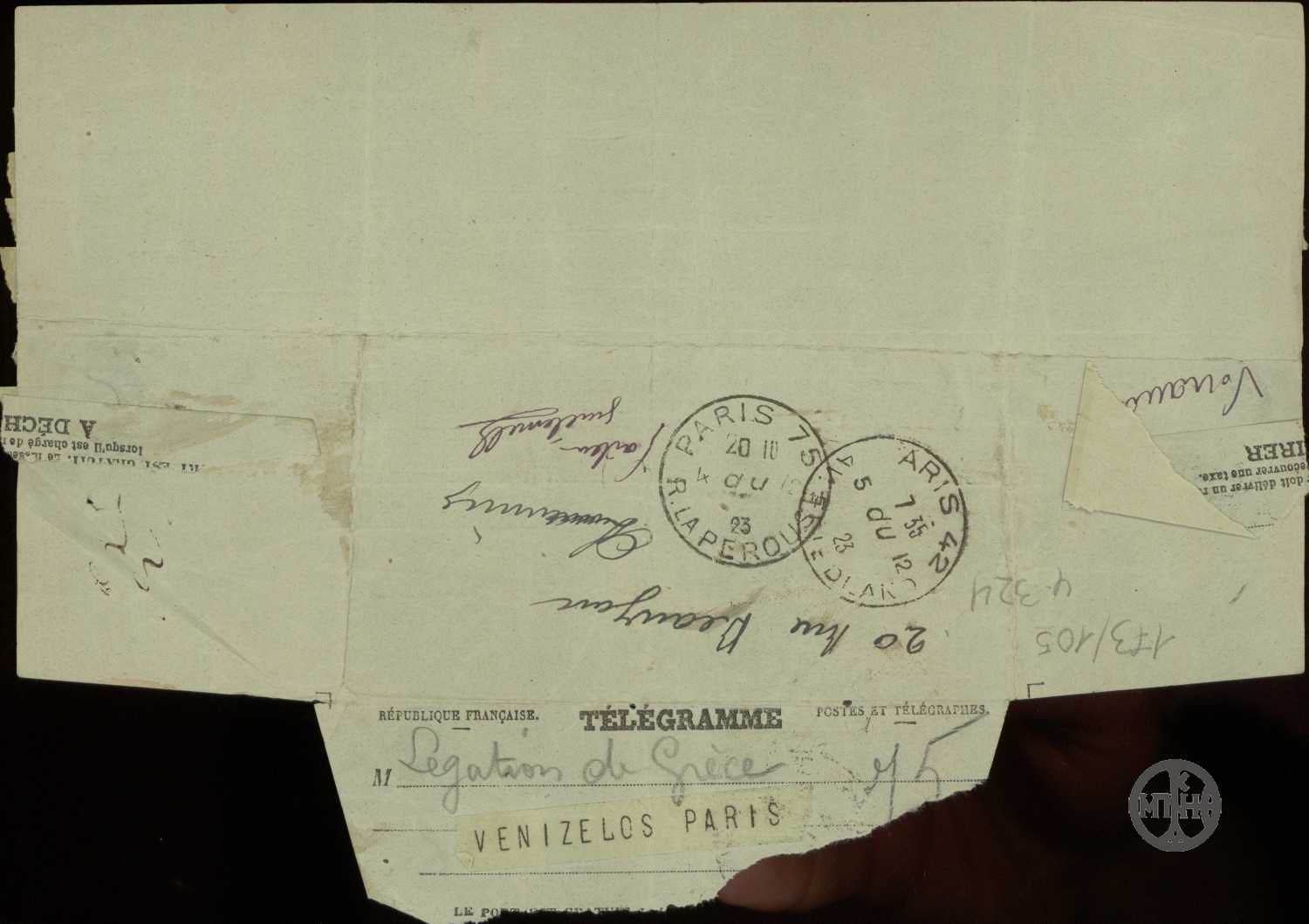 | ΤΙΤΛΟΣ | Τηλεγράφημα του Γεωργιάδη προς τον Ν.Δάλλα σχετικά με το άνοιγμα χρηματοκιβωτίου στην τράπεζα Credit Foncier d Algerie & Tunesie στη Σμύρνη. |