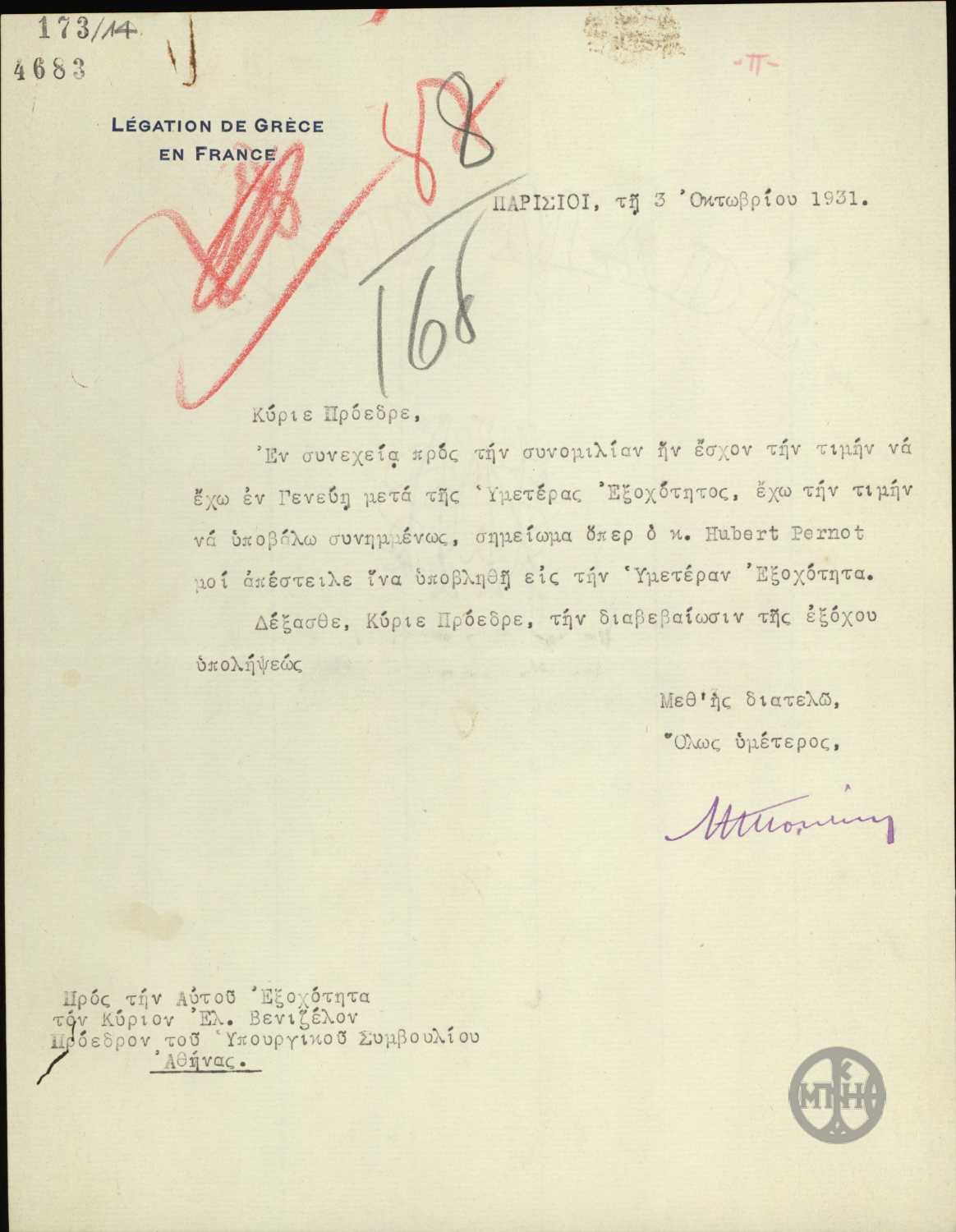 | ΤΙΤΛΟΣ | Επιστολή του Ν.Πολίτη προς τον Ε.Βενιζέλο με την οποία του διαβιβάζει σημείωμα του Hubert Pernot. |