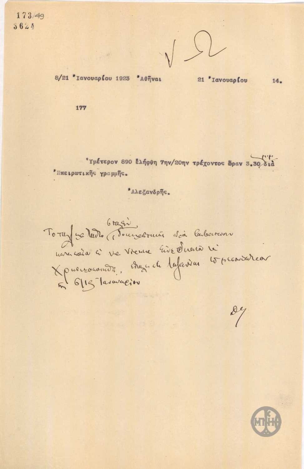 | ΤΙΤΛΟΣ | Τηλεγράφημα του Α.Αλεξανδρή σχετικά με τη λήψη τηλεγραφήματος. |