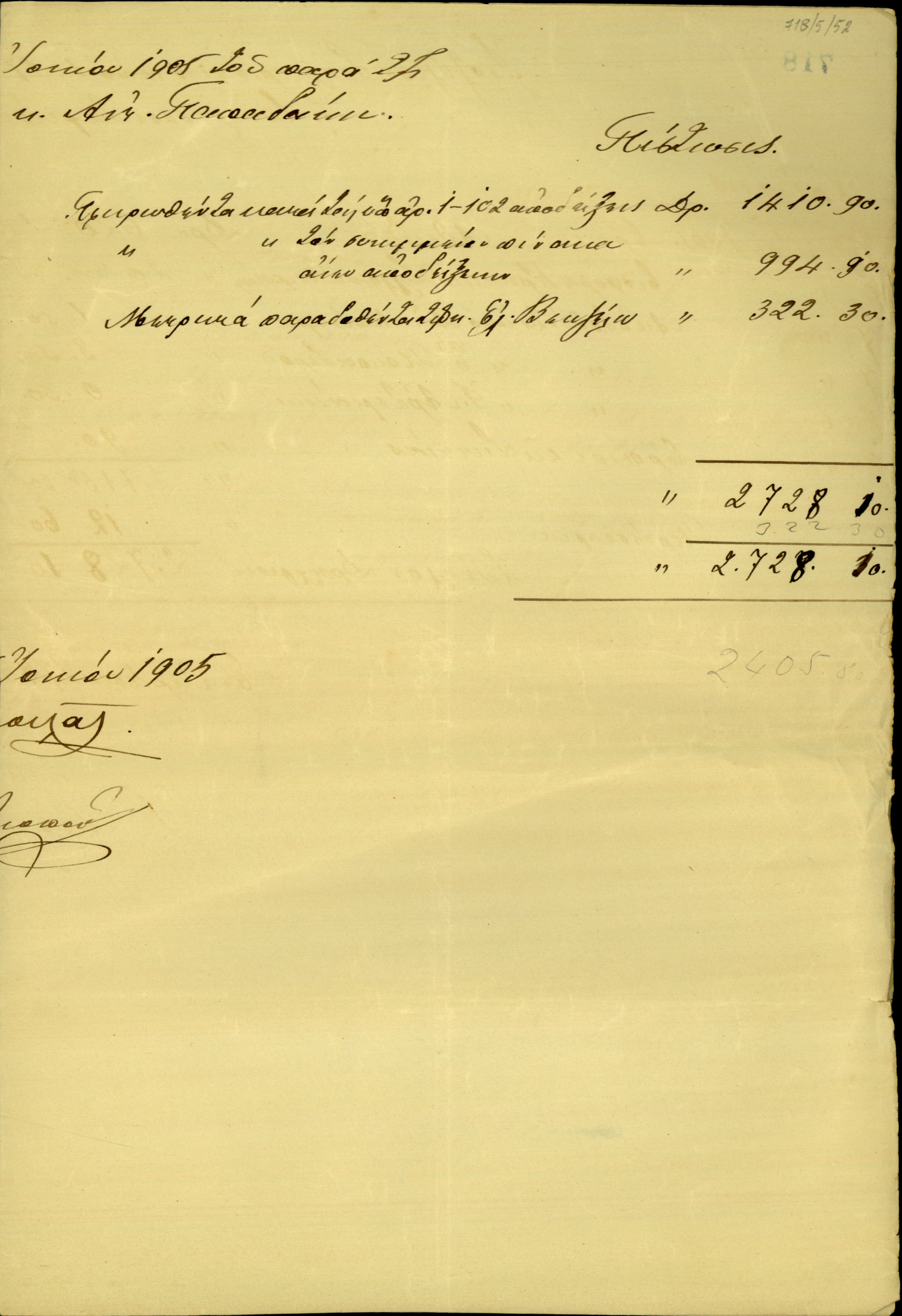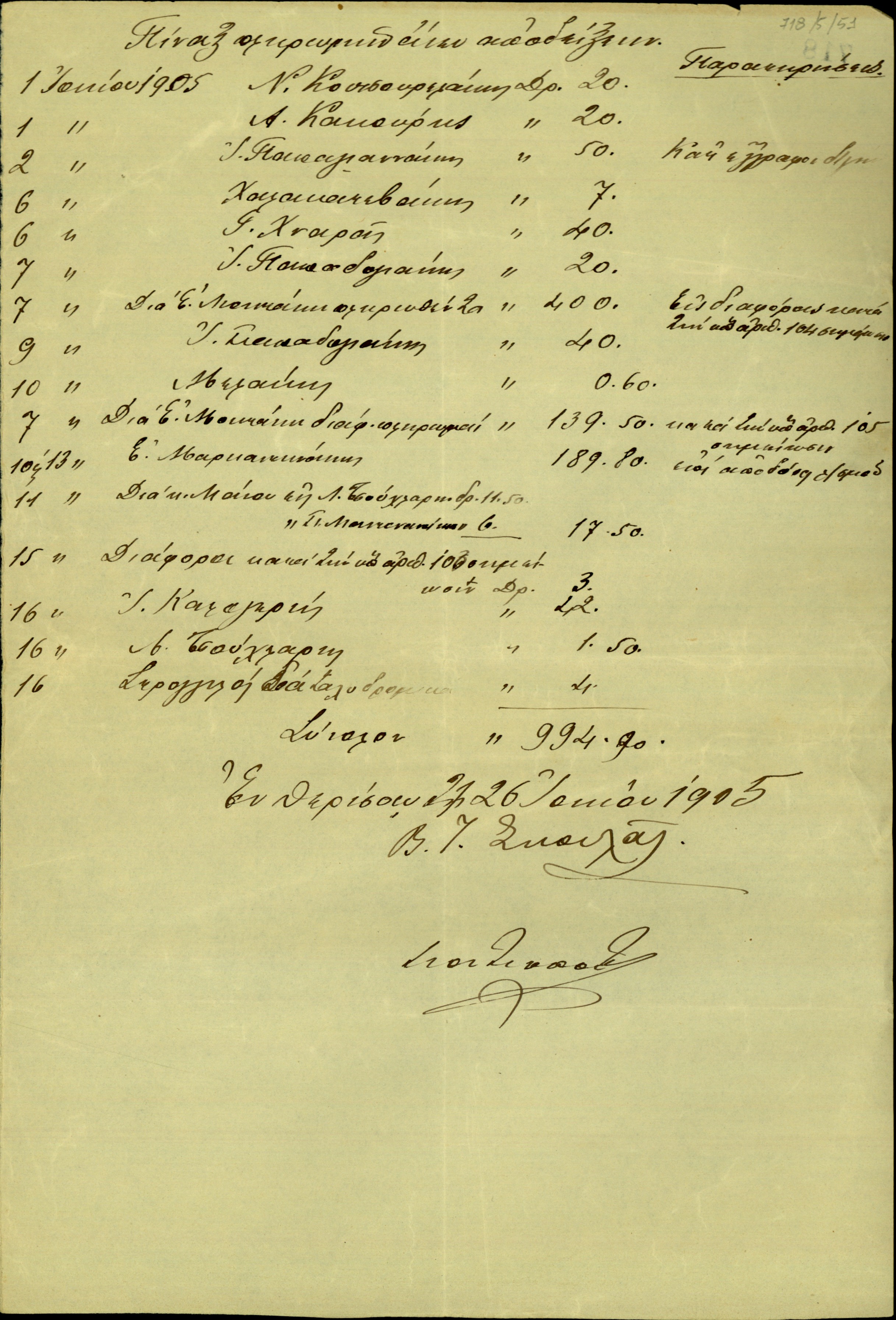 | ΤΙΤΛΟΣ | Πίνακας του Β.Ι. Σκουλά σχετικά με το ισοζύγιο της διαχείρισης του ταμείου της Επαναστατικής Συνέλευσης για την περίοδο 1-17 Ιουνίου 1905. |