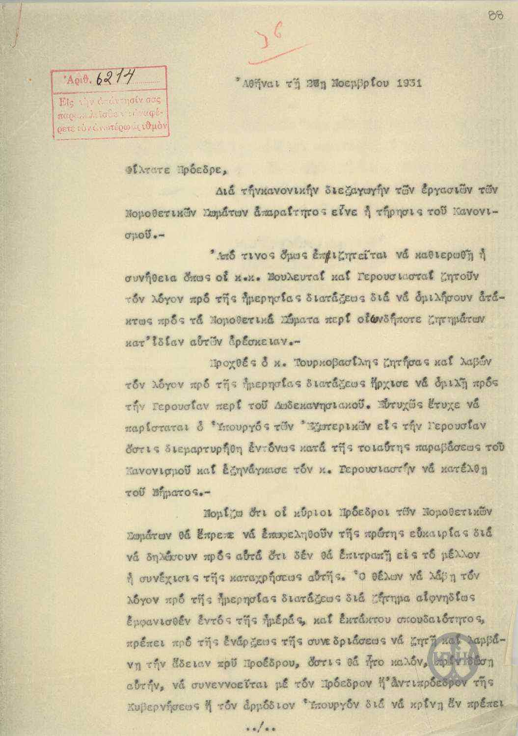 Επιστολή του Ε.Βενιζέλου προς το Λ.Παρασκευόπουλο σχετικά με τη μη τήρηση του κανονισμού κατά τη διεξαγωγή των εργασιών των Νομοθετικών Σωμάτων.