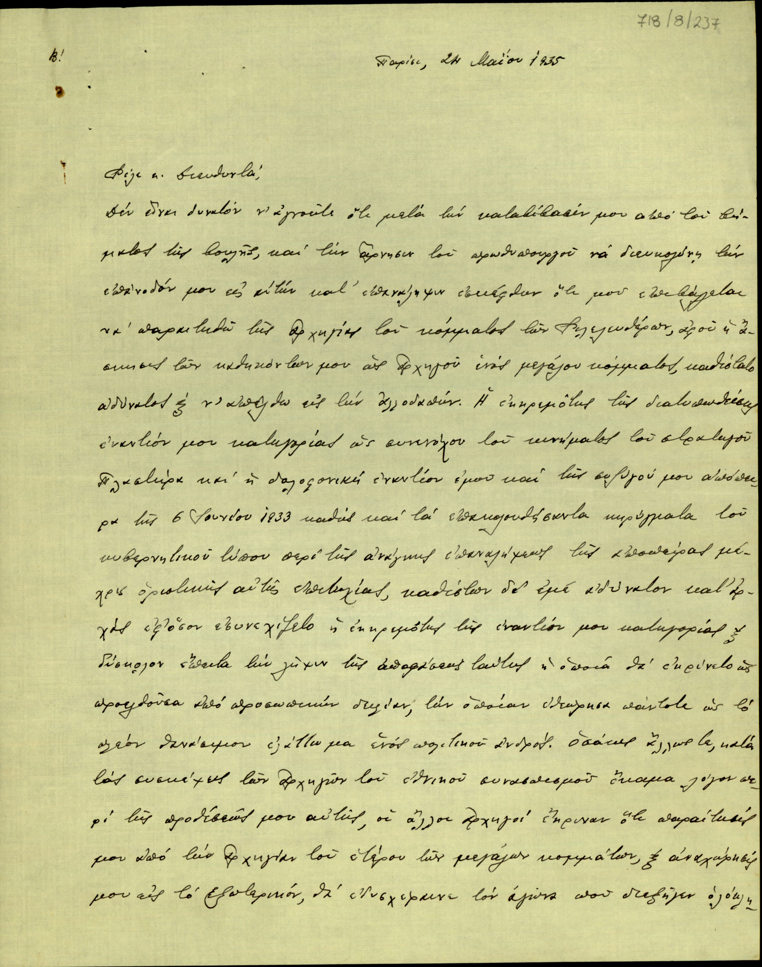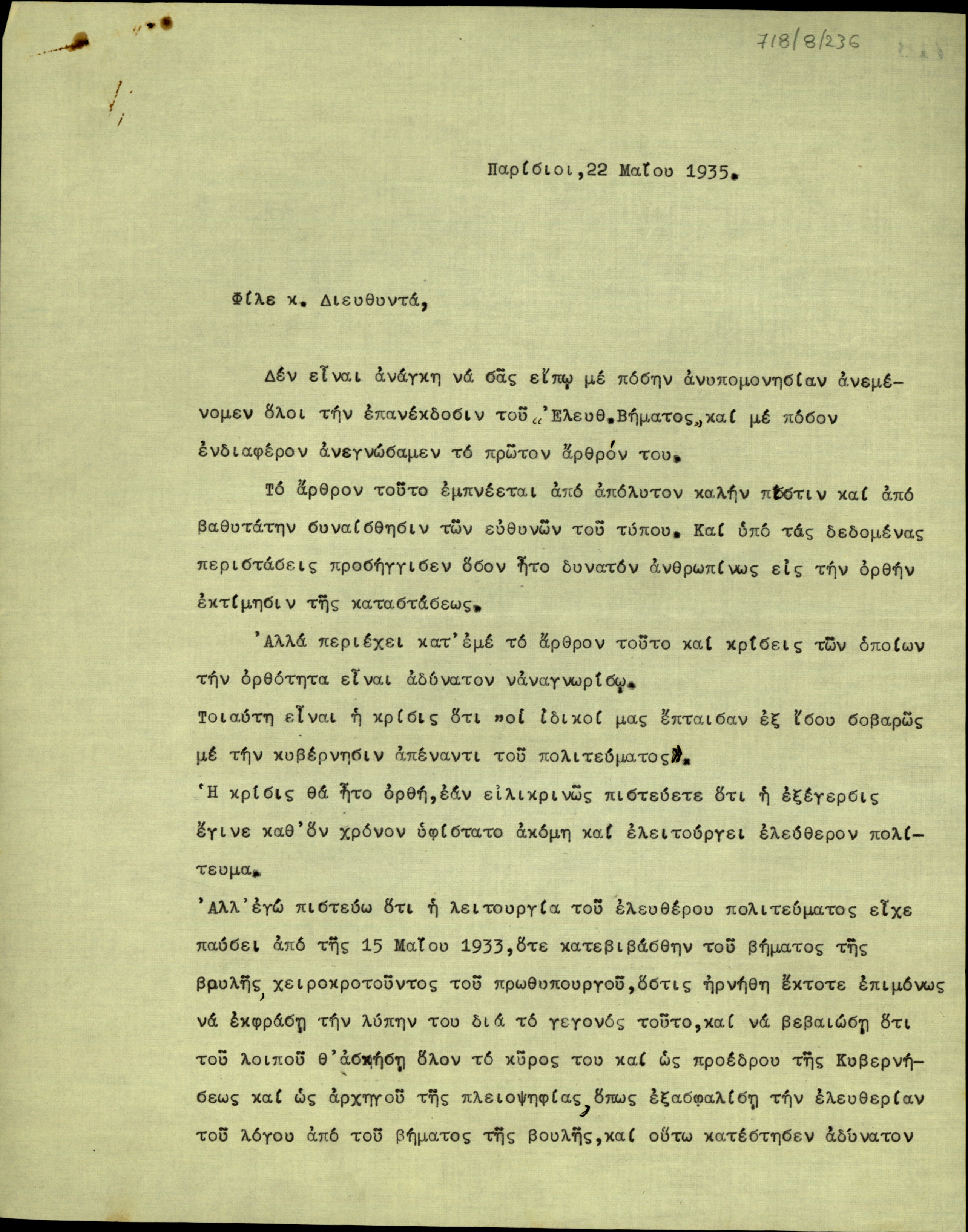| ΤΙΤΛΟΣ | Επιστολή του Ε. Βενιζέλου προς τον Διευθυντή της εφημερίδας Ελεύθερο Βήμα |