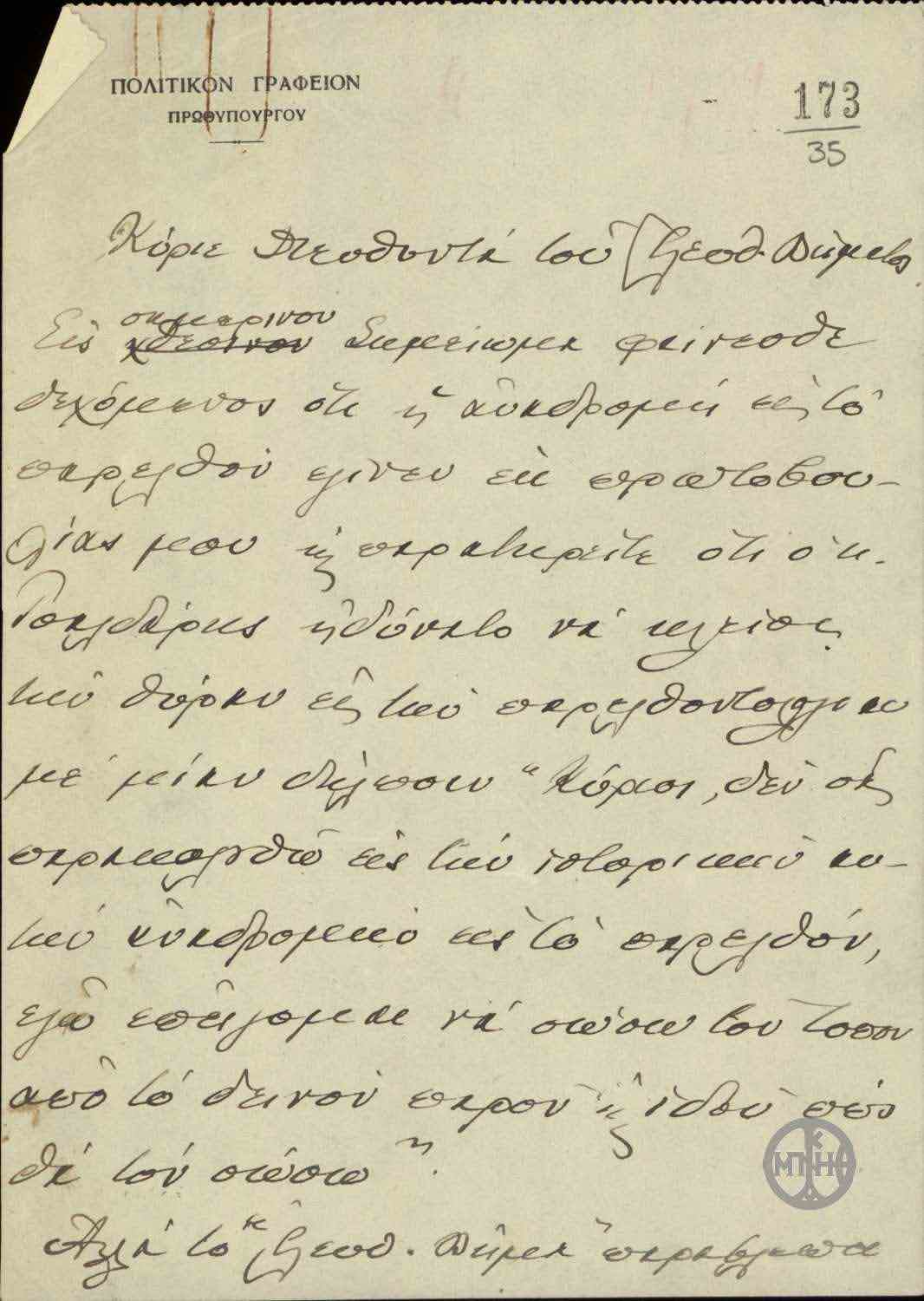 | ΤΙΤΛΟΣ | Επιστολή του Ε.Βενιζέλου προς το Διευθυντή του Ελευθέρου Βήματος σχετικά με την κατηγορία που διατυπώθηκε προς τον Ε.Βενιζέλο για παρελθοντολογία. |