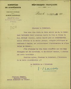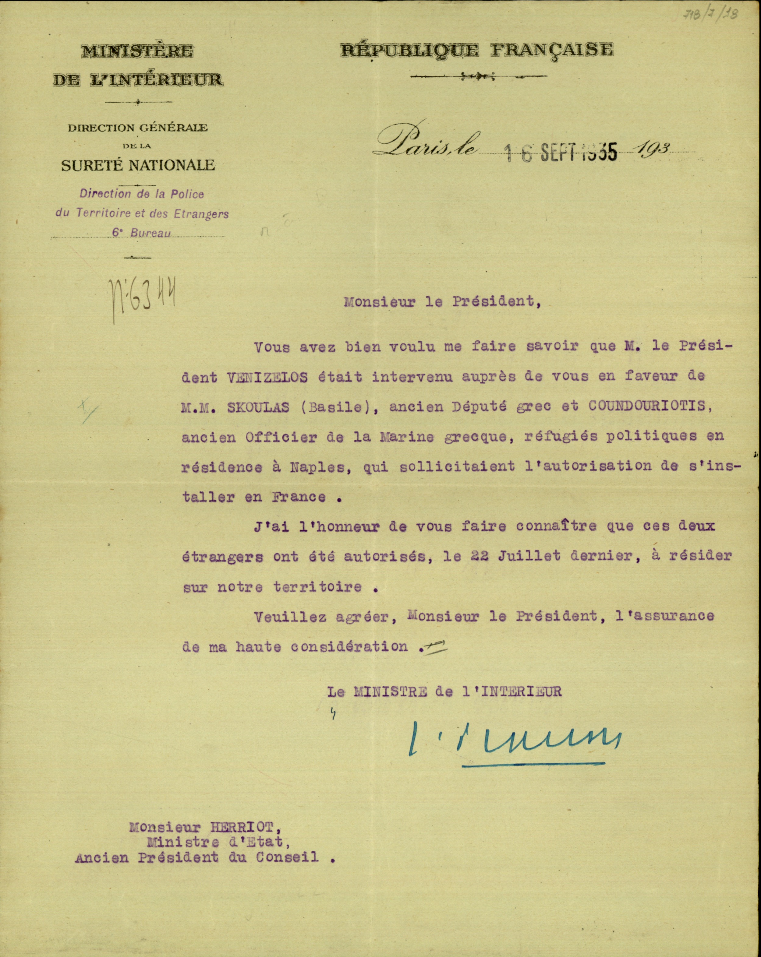 ΤΙΤΛΟΣ | Επιστολή του Γάλλου Υπουργού Εσωτερικών προς τον Υπουργό Επικρατείας, Herriot |
