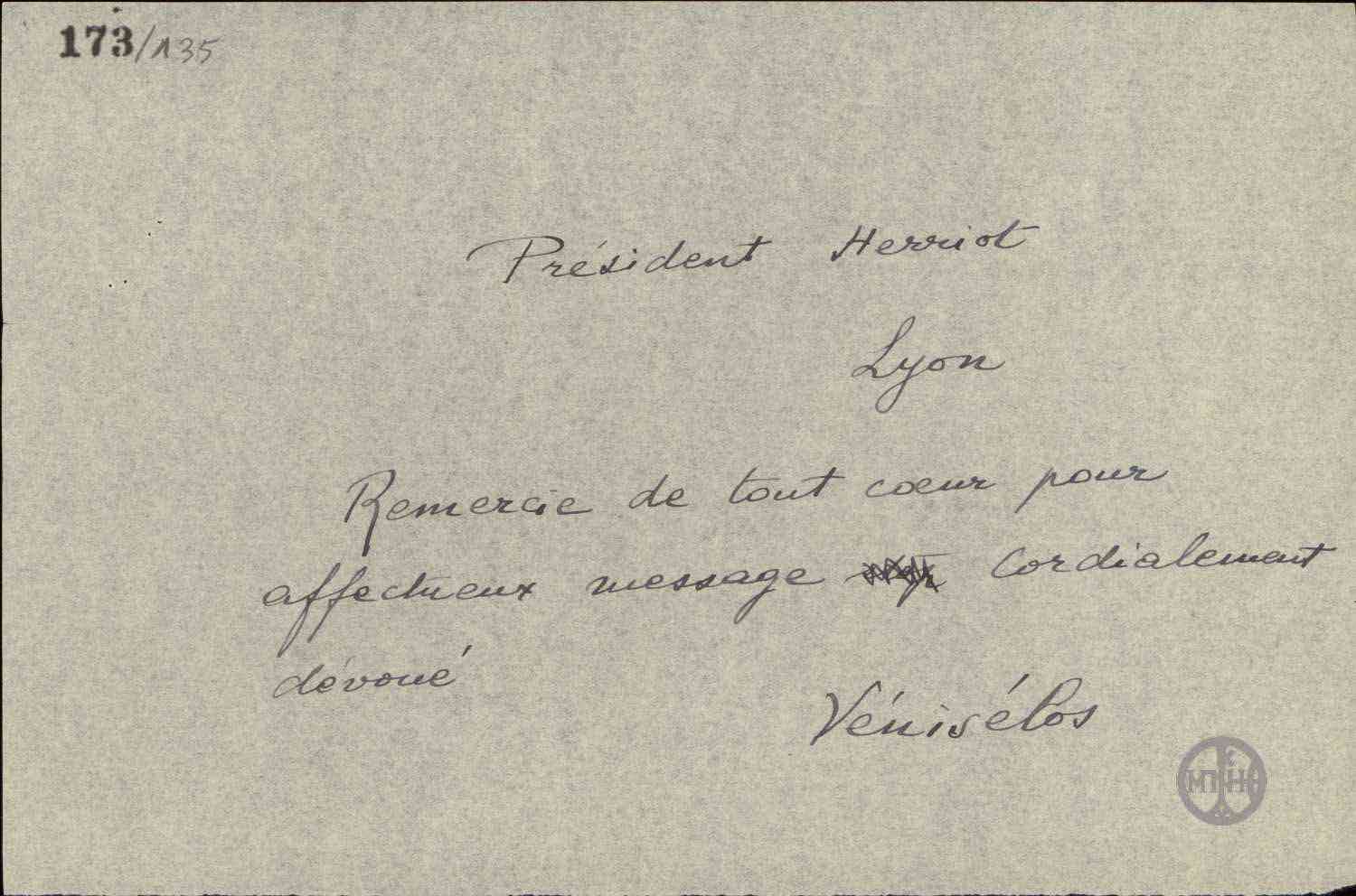 ΤΙΤΛΟΣ | Τηλεγράφημα του Ε.Βενιζέλου προς τον Herriot με το οποίο τον ευχαριστεί για τις ευχές του με αφορμή την απόπειρα δολοφονίας εναντίον του. |