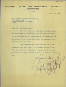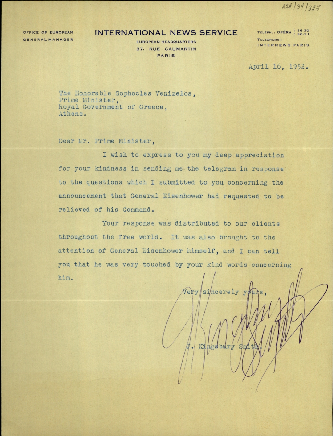| ΤΙΤΛΟΣ | Επιστολή του J. Kingsbury Smith προς τον Ε. Βενιζέλο |