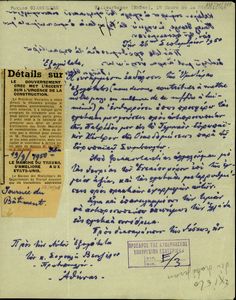 | ΤΙΤΛΟΣ | Επιστολή του Π. Γιαννουλιά προς τον Σ. Βενιζέλο με την οποία διαβιβάζει άρθρο του με τίτλο "Details sur le gouvernement grec met l' accent sur l' urgence de la construction". |