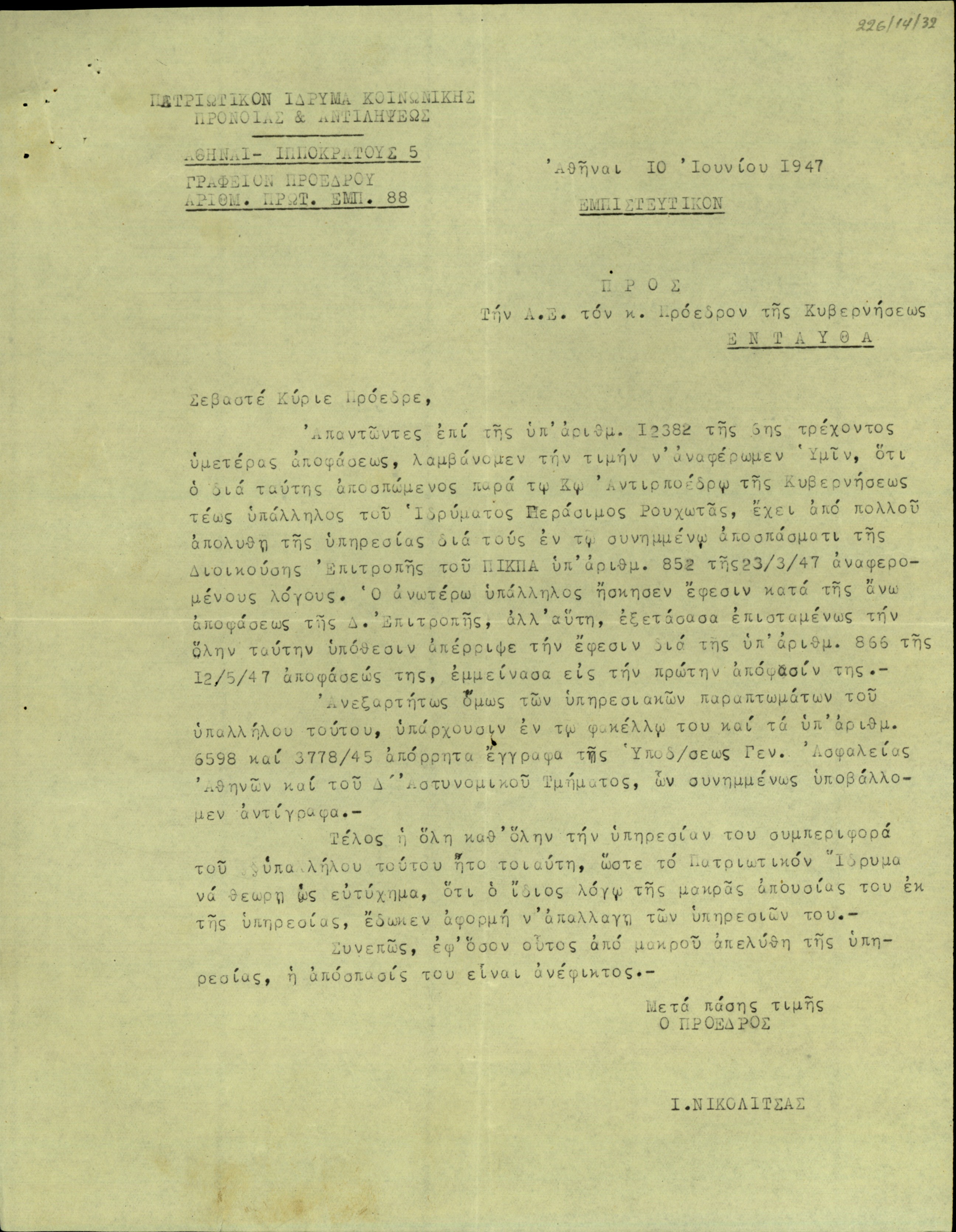 ΤΙΤΛΟΣ | Επιστολή του Προέδρου του Πατριωτικού Ιδρύματος Κοινωνικής Πρόνοιας και Αντιλήψεως, Ι. Νικολίτσα, προς τον Πρόεδρο της Ελληνικής Κυβέρνησης, Δ. Μάξιμο, σχετικά με την απόσπαση του υπαλλήλου Γερ. Ρουχωτά. |
