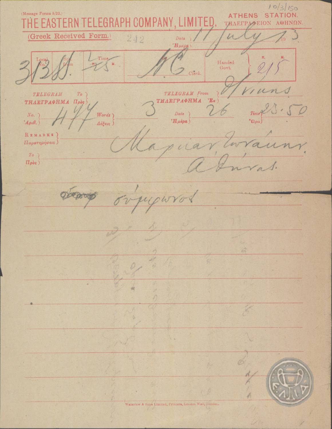 | ΤΙΤΛΟΣ | Τηλεγράφημα του Στεργιάδη προς τον Κλ.Μαρκαντωνάκη σχετικά με την παραμονή του στο Ηράκλειο. |
