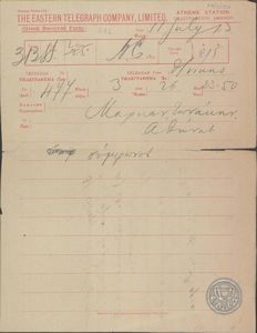 | ΤΙΤΛΟΣ | Τηλεγράφημα του Ελ. Βενιζέλου προς τον Κλέαρχο Μαρκαντωνάκη κοινωνικού περιεχομένου |