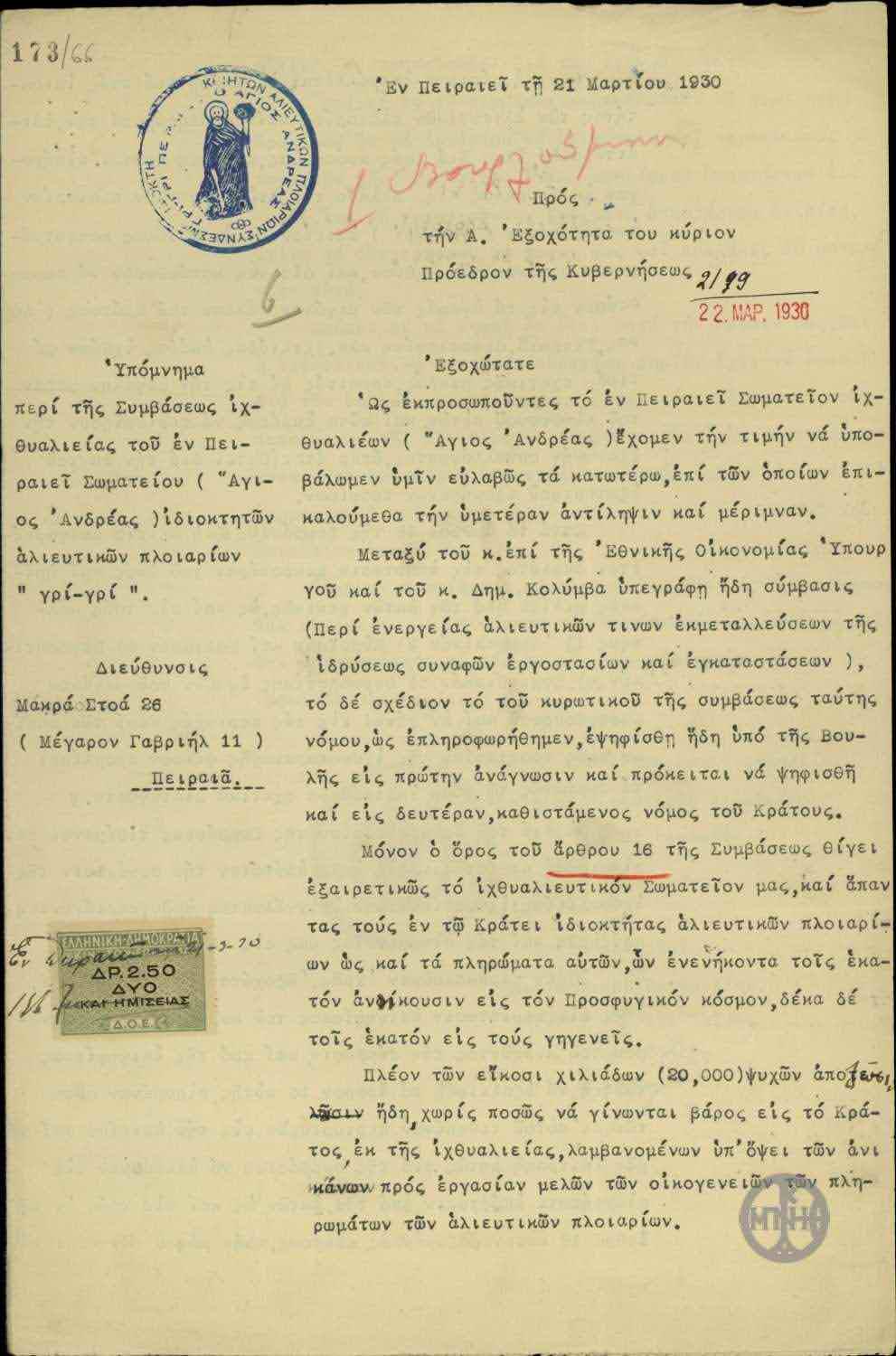 | ΤΙΤΛΟΣ | Υπόμνημα του Σωματείου Ιδιόκτητων αλιευτικών πλοιαρίων "Αγ.Ανδρέας",τύπου γρί-γρί, προς τον Ε.Βενιζέλο σχετικά με τη σύμβαση περί ενεργείας αλιευτικών τινών εκμεταλλεύσεων της ιδρ΄θσεως συναφών εργοστασίων και εγκαταστάσεων. |