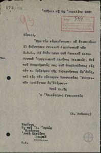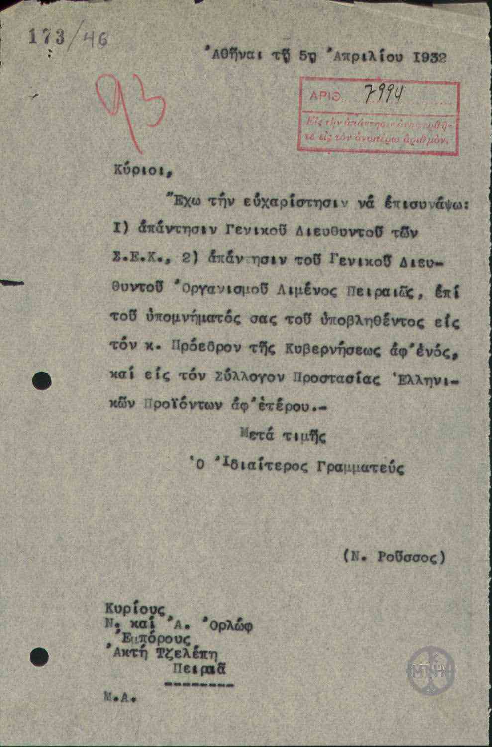 | ΤΙΤΛΟΣ | Διαβιβαστικό του Ν. Ρούσου προς τον εμπορικό οίκο Ν.& Α. Ορλώφ εγγράφου του Διευθυντή των ΣΕΚ και του Γενικού Διευθυντή του ΟΛΠ σχετικά με υπόμνημά τους στον Σύλλογο Προστασίας Ελληνικών Προϊόντων και τον πρωθυπουργό. |