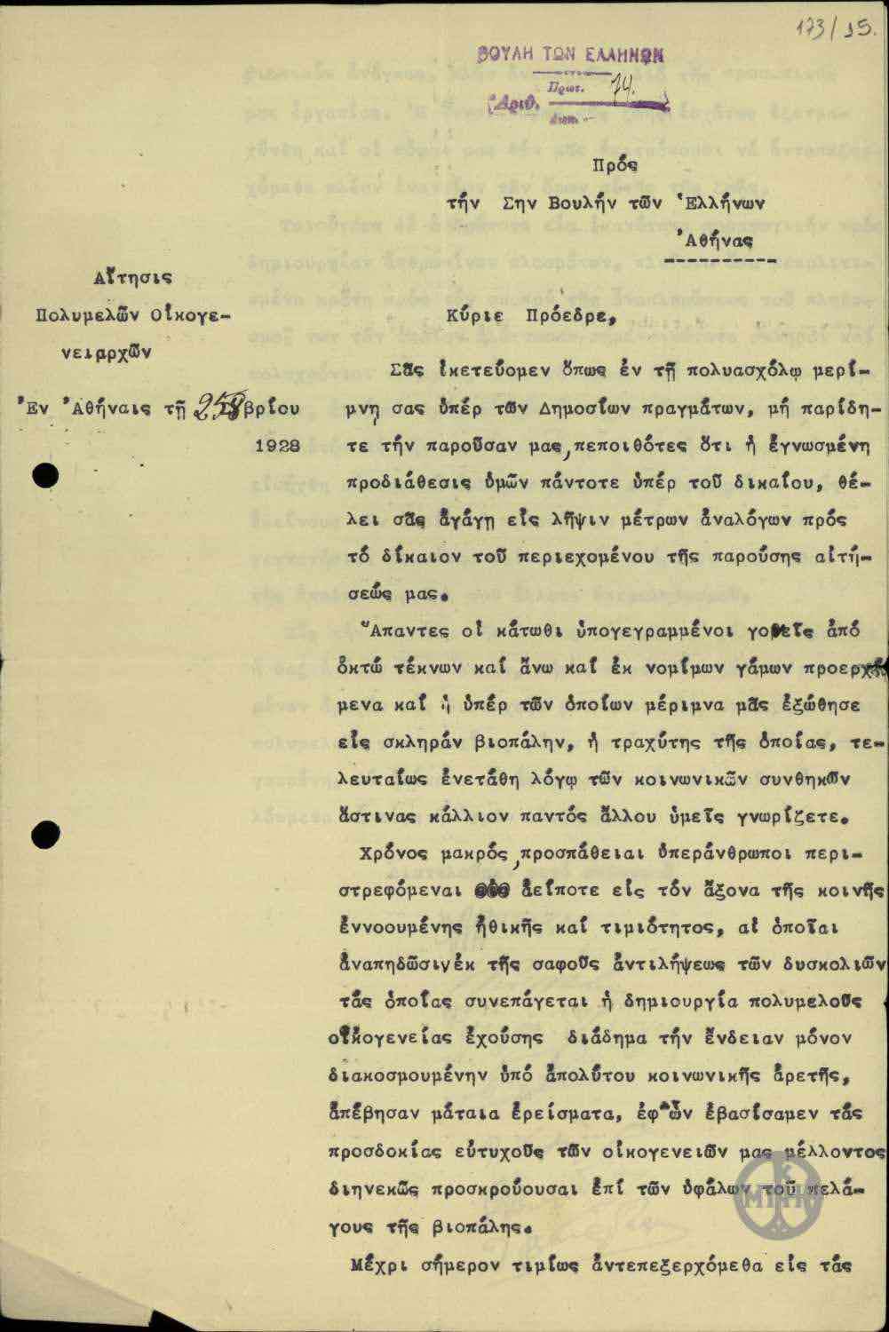 | ΤΙΤΛΟΣ | Αίτησις Πολυμελών Οικογενειαρχών προς τη Βουλήν των Ελλήνων για τη λήψη μέτρων βοηθητικών της κατάστασής τους. |
