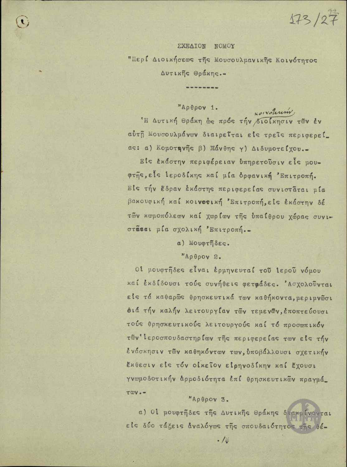 | ΤΙΤΛΟΣ | Σχέδιον νόμου "περί διοικήσεως της Μουσουλμανικής Κοινότητος Δυτικής Θράκης" |
