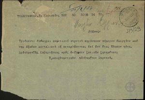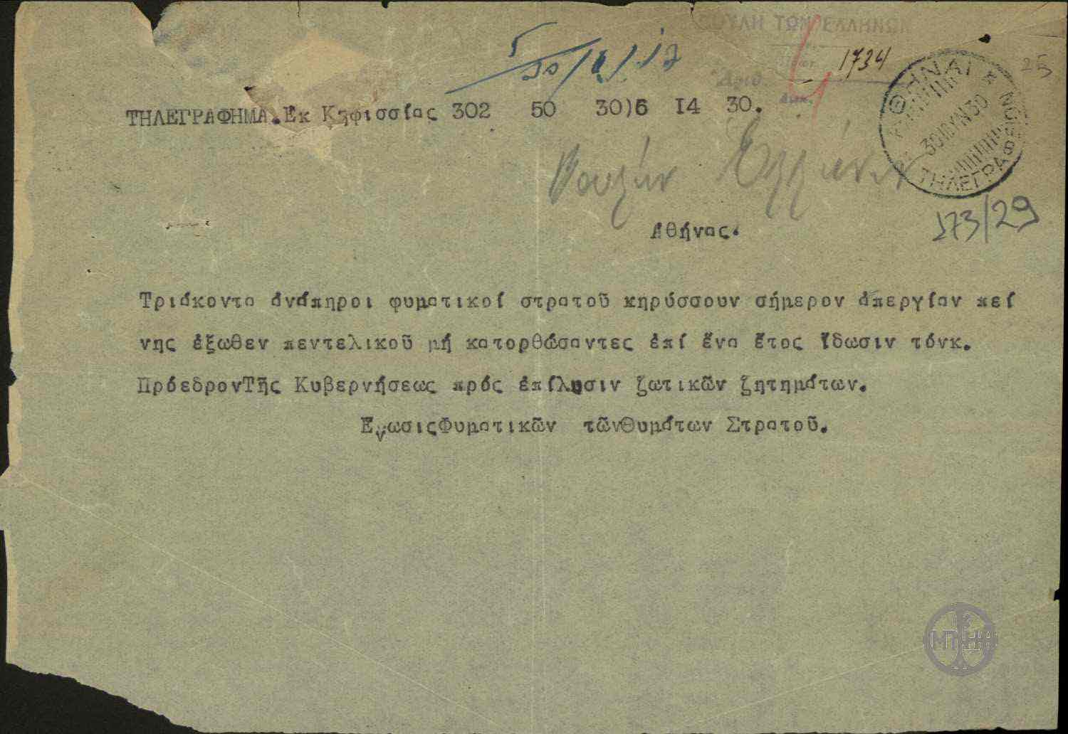 | ΤΙΤΛΟΣ | Τηλεγράφημα από την Ένωση Φυματικών των Θυμάτων Στρατού προς τη Βουλή των Ελλήνων |