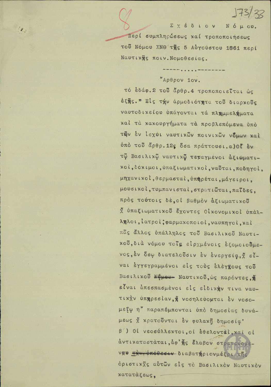 | ΤΙΤΛΟΣ | Σχέδιον νόμου περί συμπληρώσεως και τροποποιήσεως του Νόμου ΧΝΘ' της 5 Αυγούστου 1861 περί Ναυτικής ποιν.νομοθεσίας |