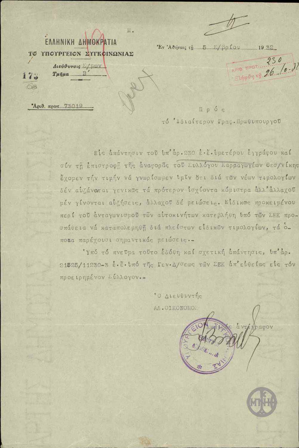 | ΤΙΤΛΟΣ | Επιστολή του Άγγ.Οικονόμου προς το Ιδιαίτερο Γραφείο του Πρωθυπουργού σχετικά με το νέο τιμολόγιο στα ισχύοντα σιδηροδρομικά κόμιστρα. |