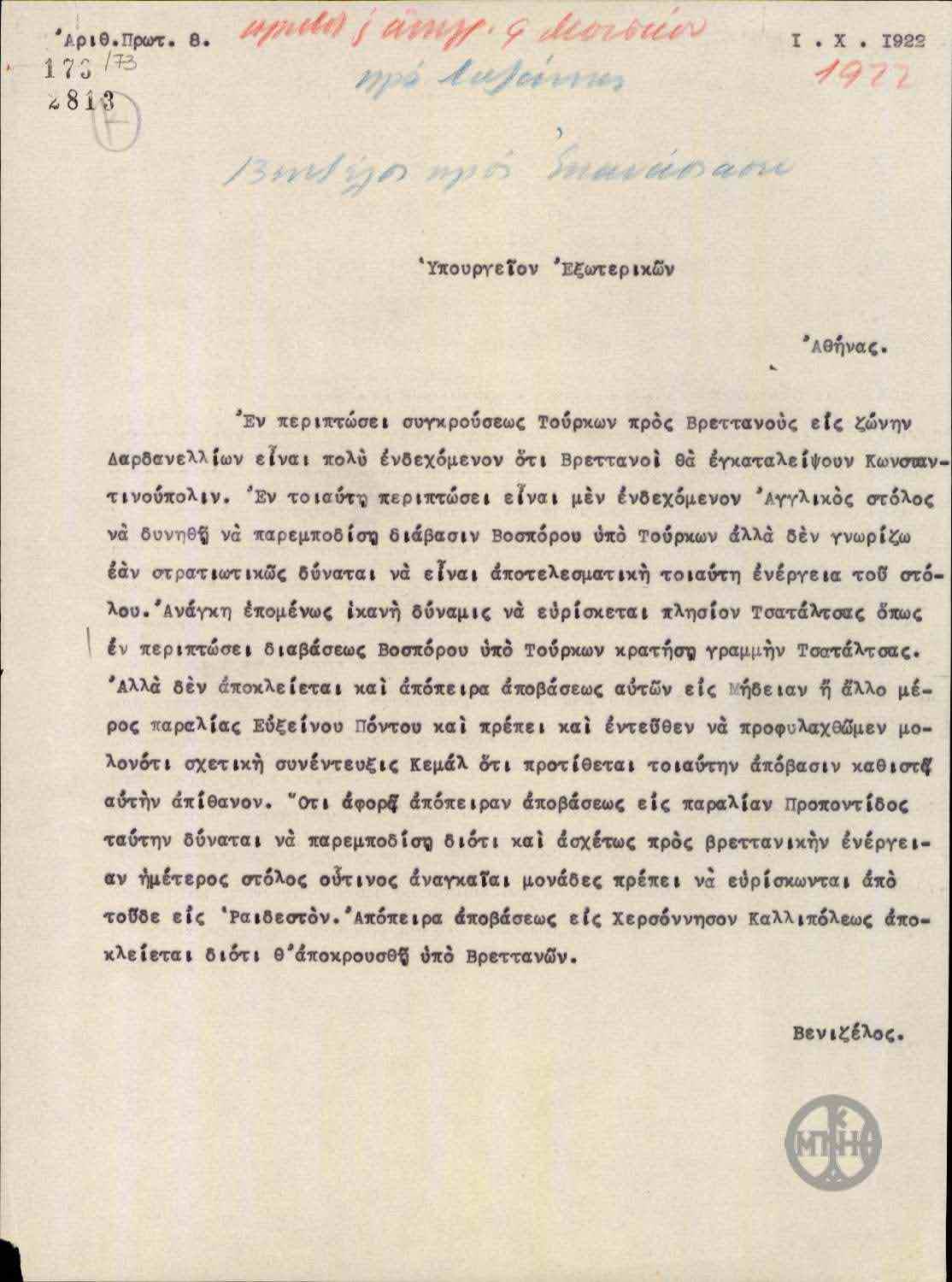 | ΤΙΤΛΟΣ | Τηλεγράφημα του Ε.Βενιζέλου προς το Υπουργείο Εξωτερικών σχετικά με τις πιθανές κινήσεις των Άγγλων σε περίπτωση σύγκρουσής τους με τους Τούρκους. |