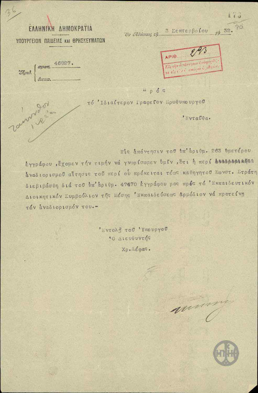 | ΤΙΤΛΟΣ | Επιστολή του Χρ.Λέφα προς το Ιδιαίτερο Γραφείο του Πρωθυπουργού σχετικά με την αίτηση αναδιορισμού τέως καθηγητή. |