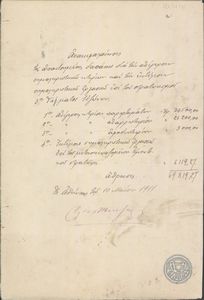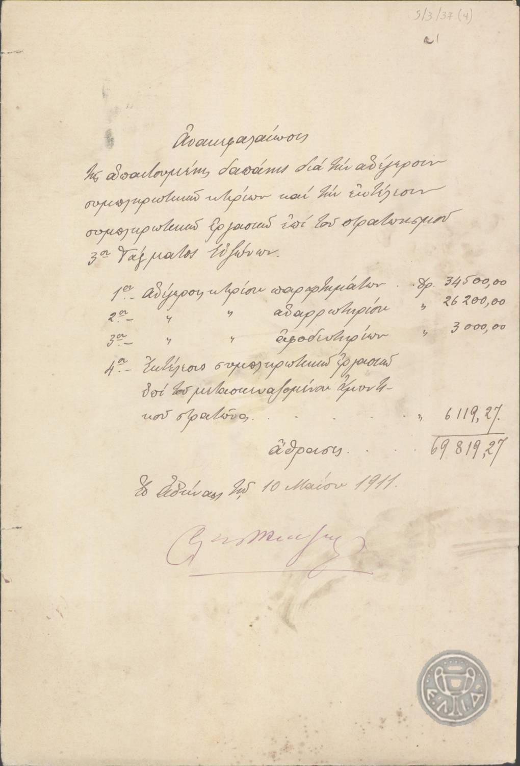 Σημείωμα του Ε.Βενιζέλου, όπου υπολογίζονται οι δαπάνες για συμπληρωματικές εργασίες στο 3ο Τάγμα Ευζώνων.