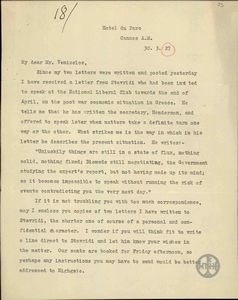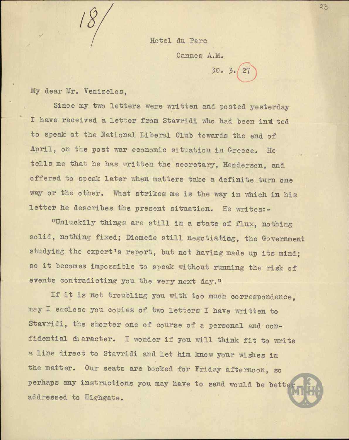 | ΤΙΤΛΟΣ | Επιστολή του A.Crosfield προς τον Ε.Βενιζέλο, με την οποία διαβιβάζει γράμματα που απέστειλε στον Stavridi σχετικά με τις απόψεις που εξέφρασε για τη μεταπολεμική οικονομική κατάσταση της Ελλάδας. |