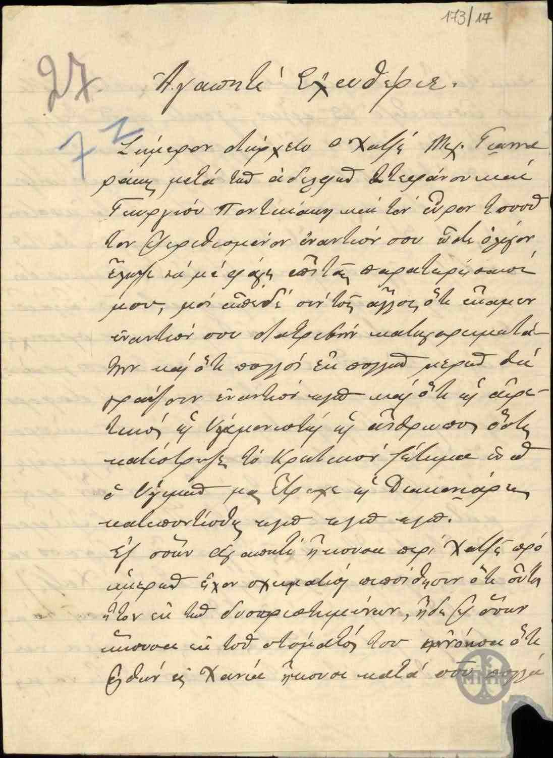 | ΤΙΤΛΟΣ | Επιστολή ξαδέλφου του Ε.Βενιζέλο προς αυτόν σχετικά με τη δυσαρέσκεια που έχει δημιουργηθεί στα Χανιά εναντίον του από μερίδα του κόσμου για την εξέλιξη του Κρητικού ζητήματος. |