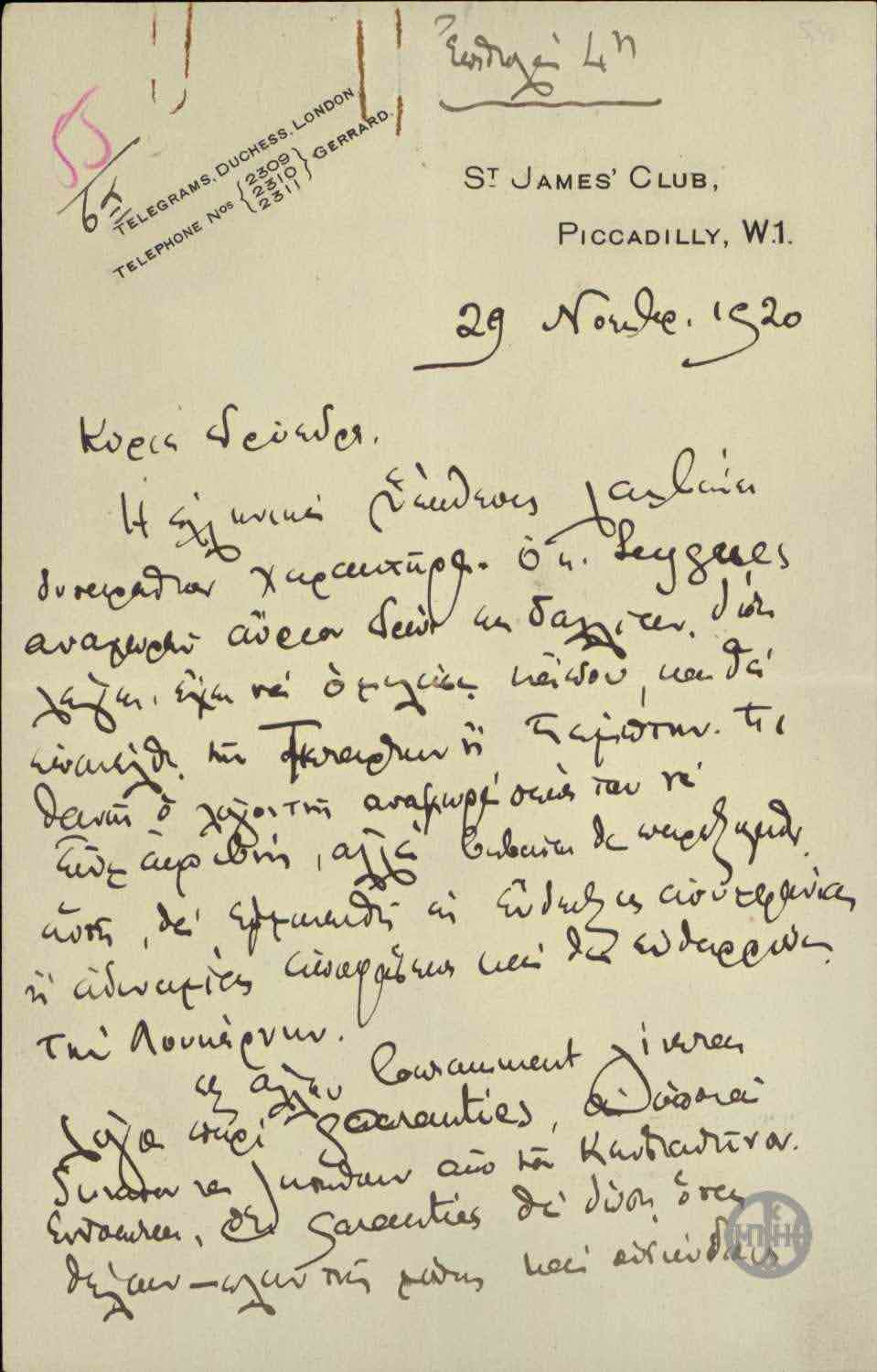 | ΤΙΤΛΟΣ | Επιστολή του Π.Βουρλούμη προς τον Ε.Βενιζέλο σχετικά με την ανάγκη παρέμβασης του Ε.Βενιζέλου για την αποφυγή περαιτέρω καταστροφής. |
