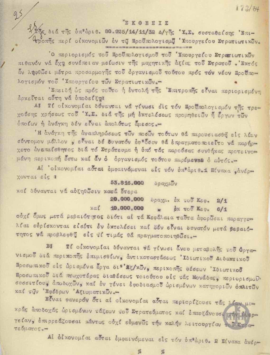 | ΤΙΤΛΟΣ | Έκθεσις της δια της υπ αριθμ. 80.925/14/11/32 Δ/γής Υ.Σ. συσταθείσης Επιτροπής περί οικονομιών εν τω προϋπολογισμώ Υπουργείου Στρατιωτικών. |