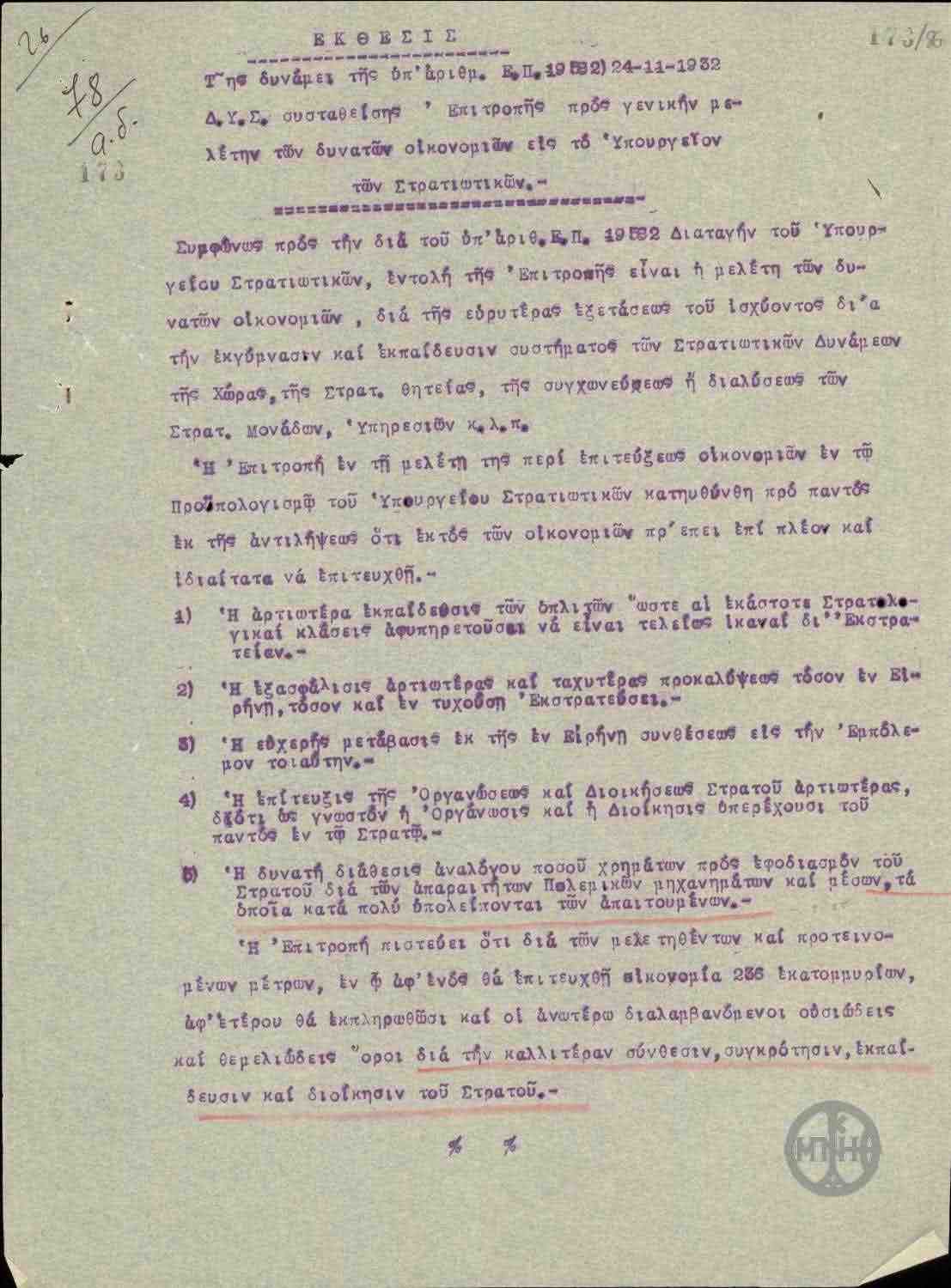 | ΤΙΤΛΟΣ | Έκθεση της δυνάμει τς υπαριθμ. Ε.Π. 19582/24-11-1932 Δ.Υ.Σ. συσταθείσης Επιτροπής προς γενικήν μελέτην των δυνατών οικονομιών εις το Υπουργείον Στρατιωτικών. |