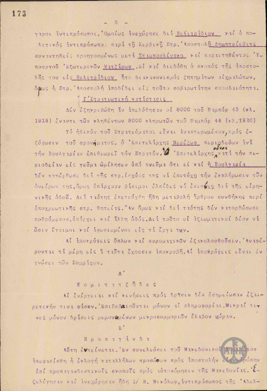 | ΤΙΤΛΟΣ | Έκθεση του διευθυντή του ΙΙ Γραφείου της Επιτελικής Υπηρεσίας προς τον Ε.Βενιζέλο σχετικά με την κατάσταση στην Βουλγαρία. |